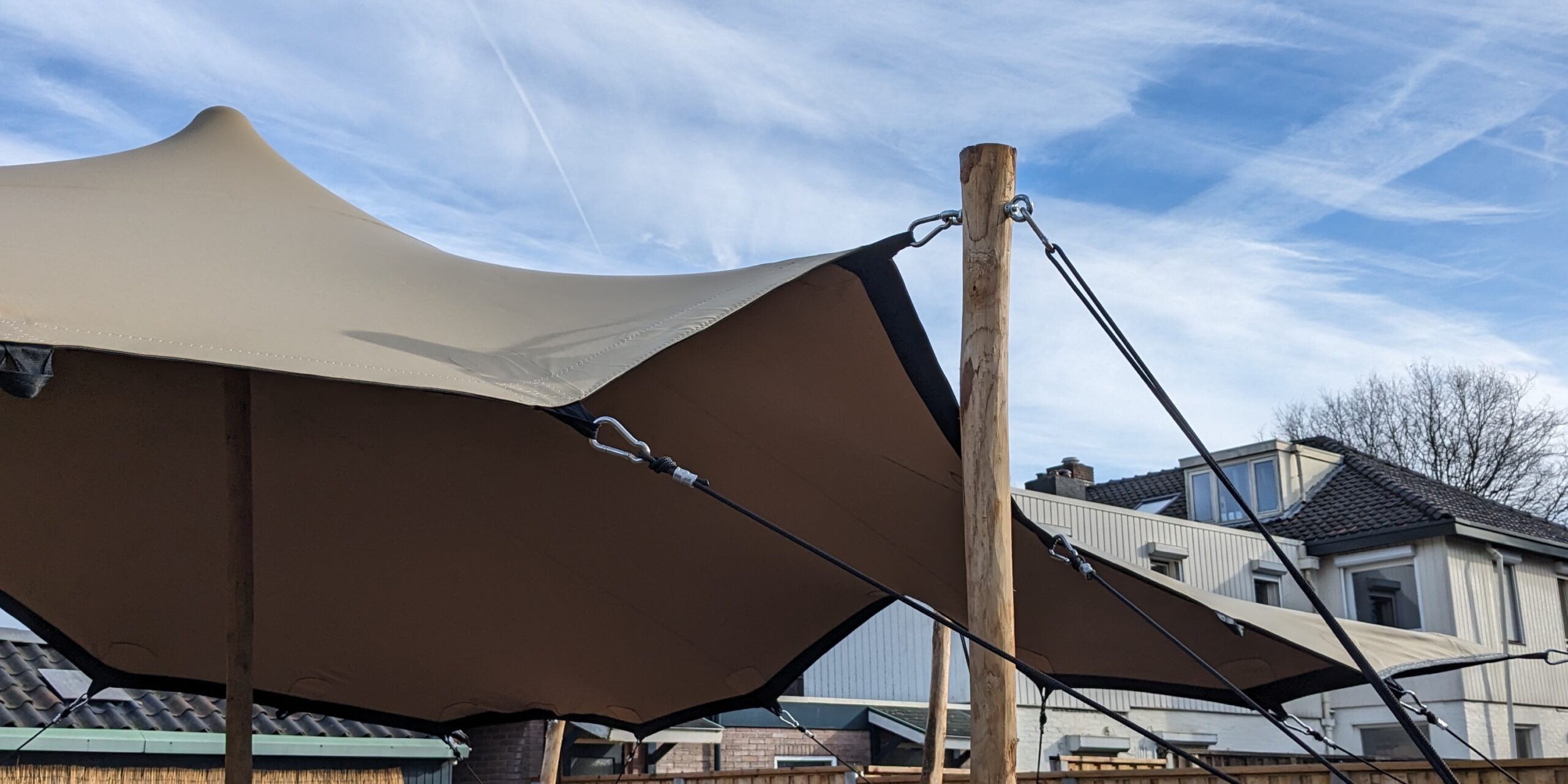 Zeildoek: Het stevige zeildoek vormt het hoofdgedeelte van de stretchtent en biedt bescherming tegen de elementen.
