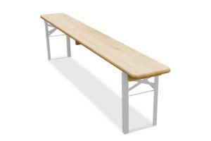 Degelijke bierbank van 180 cm lang, gemaakt van blank gelakt hout met een inklapbaar stalen frame.