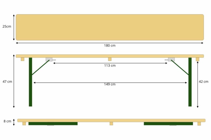 Het blad is vervaardigd uit hoogwaardig Europees dennenhout en meerdere malen gelakt voor extra bescherming. Dankzij de 30 mm bladdikte is deze bierbank extra stevig en duurzaam. De bovenzijde is 3x gelakt, terwijl de onderzijde 2x gelakt is. Onder het blad bevinden zich 3 verstevigingsbalken die niet alleen extra stabiliteit bieden, maar ook het frame beschermen wanneer de bank is ingeklapt.