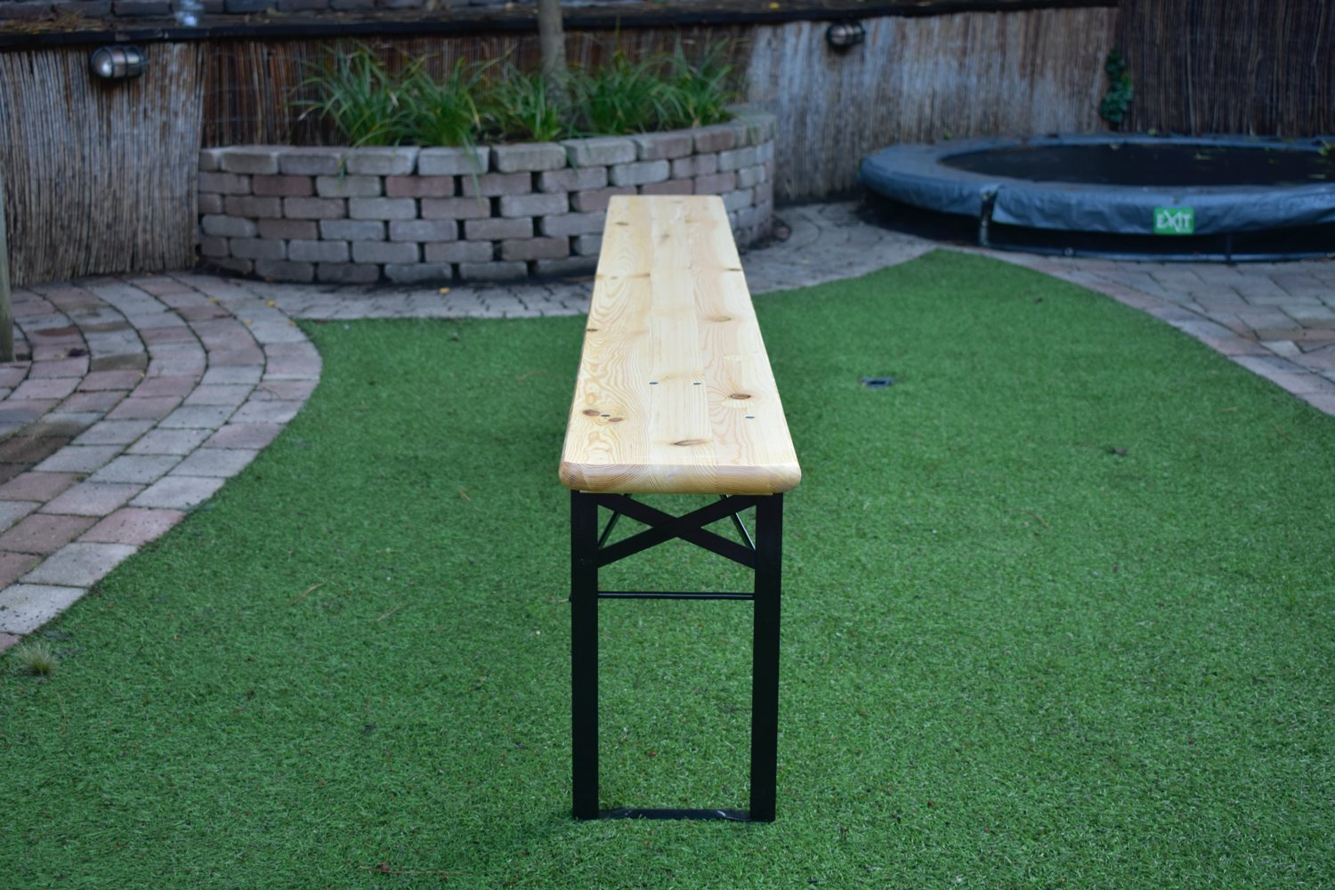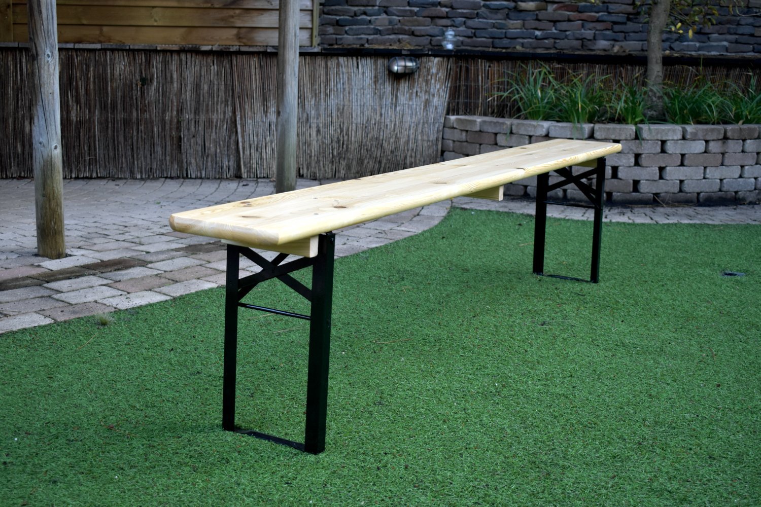 Degelijke bierbank van 220 cm lang, gemaakt van blank gelakt hout met een inklapbaar stalen frame.