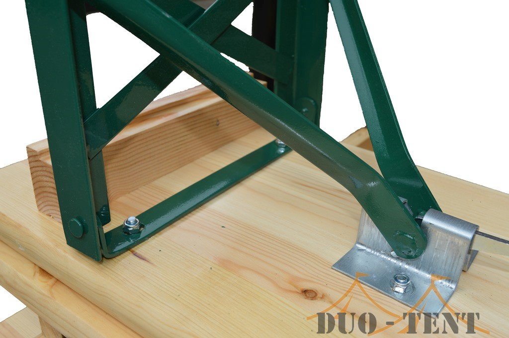 Het frame bestaat uit 2 gepoedercoate stalen onderstellen met kliksloten, bevestigd met verzinkte slotbouten. Dit garandeert een solide en betrouwbaar geheel dat bestand is tegen intensief gebruik.