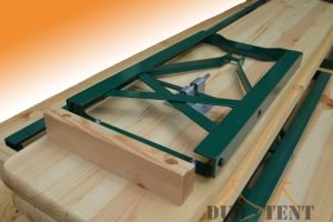 Onder het blad zitten 3 verstevigingsbalken. Deze beschermen tevens het frame wanneer de bank is ingeklapt.