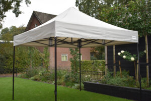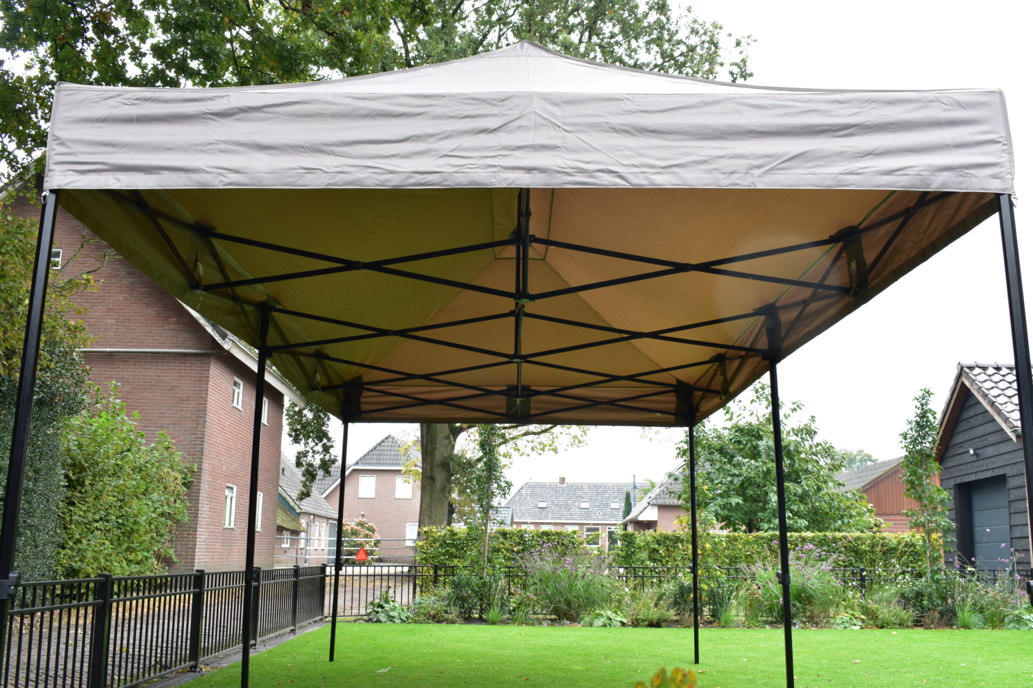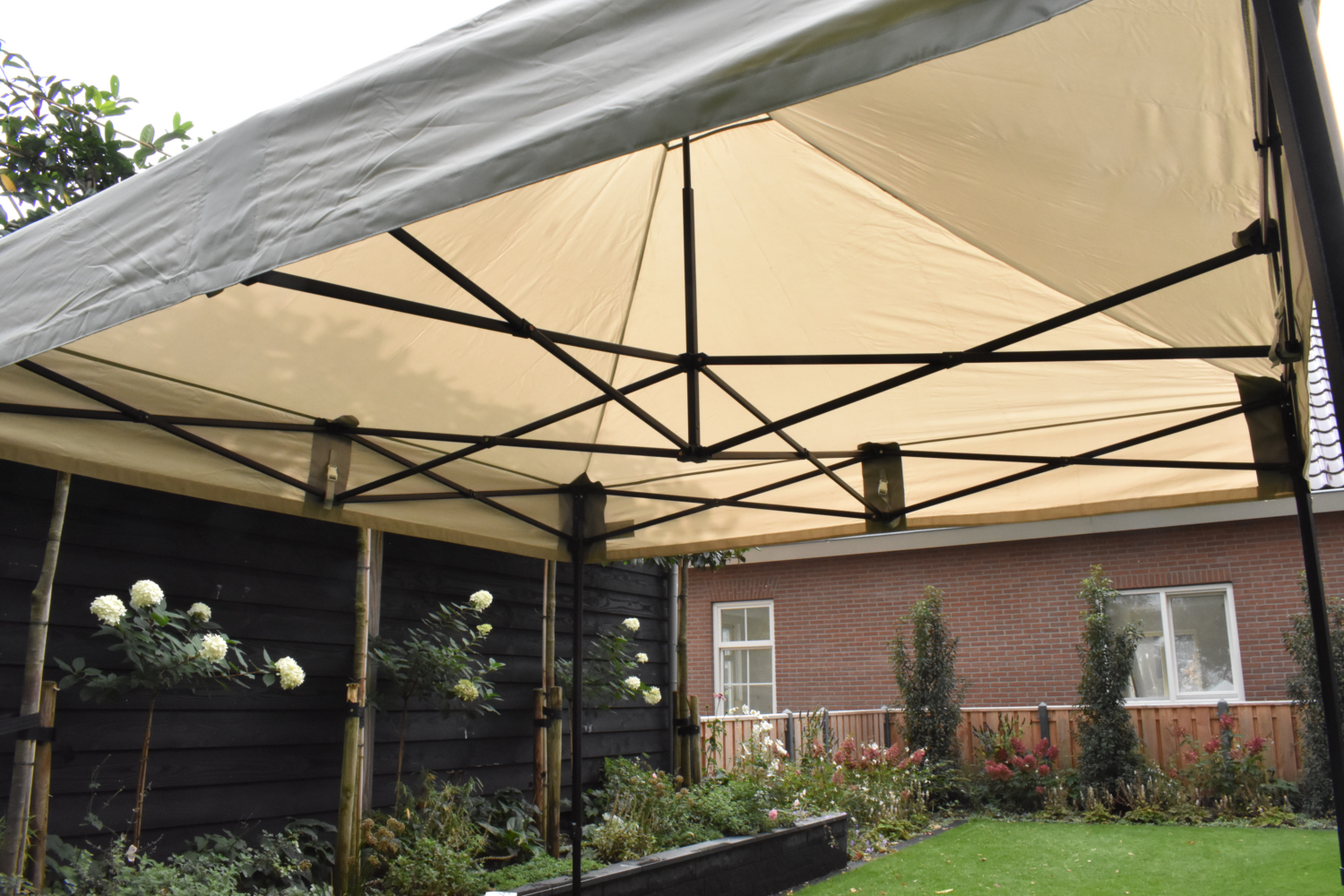 Na gebruik kun je het dakzeil gewoon op het frame laten zitten en het frame in elkaar schuiven, wel even de gespen openen.