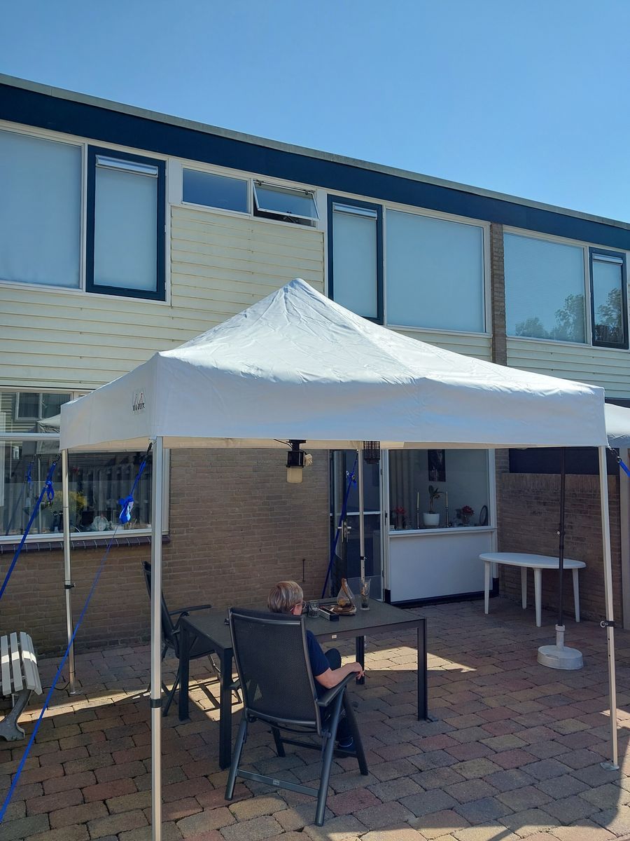 We hebben door het slechte weer op het moment te partytent nog niet staan. We gaan ervan uit dat het dakzeil wel zal passen.