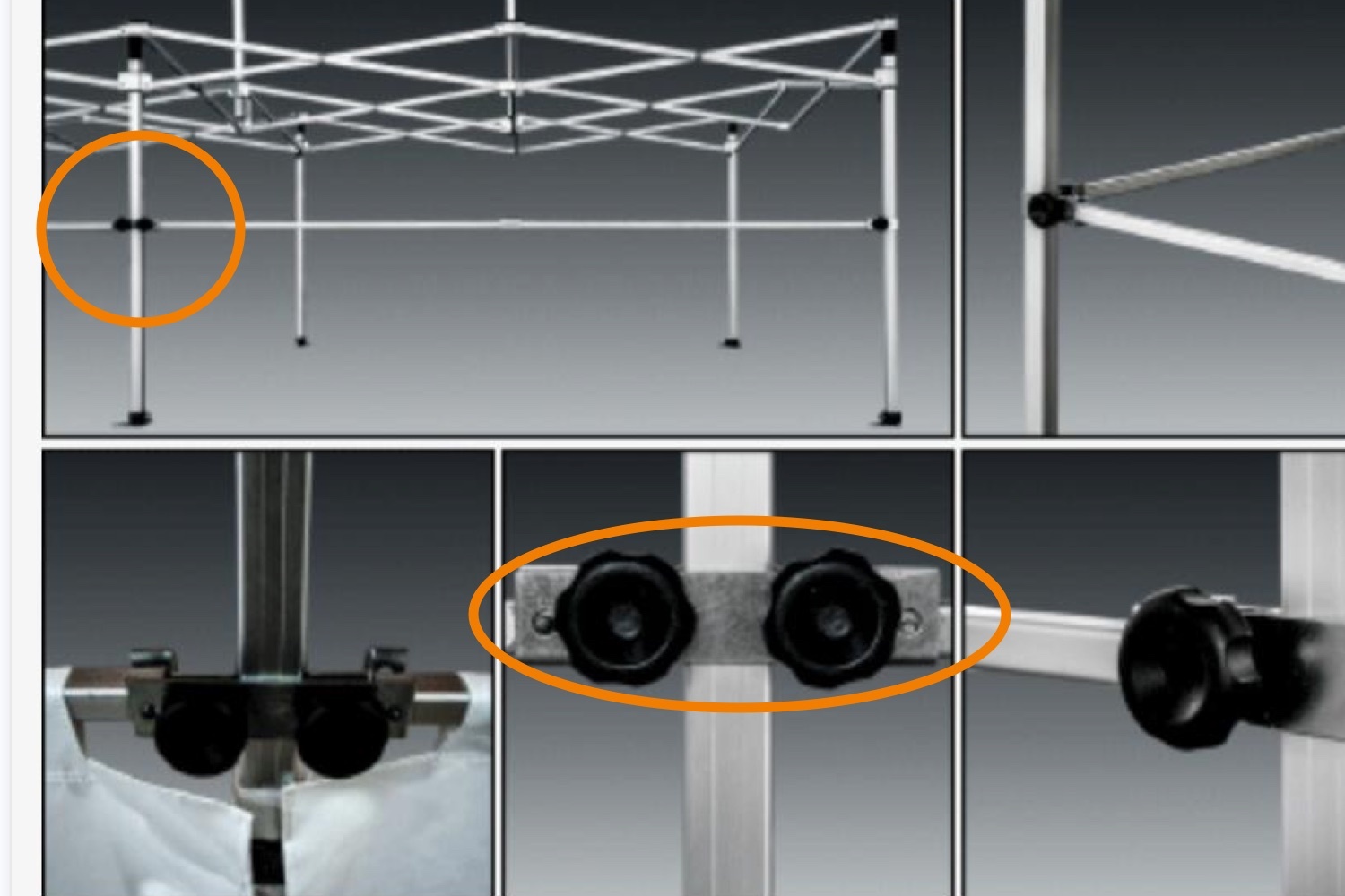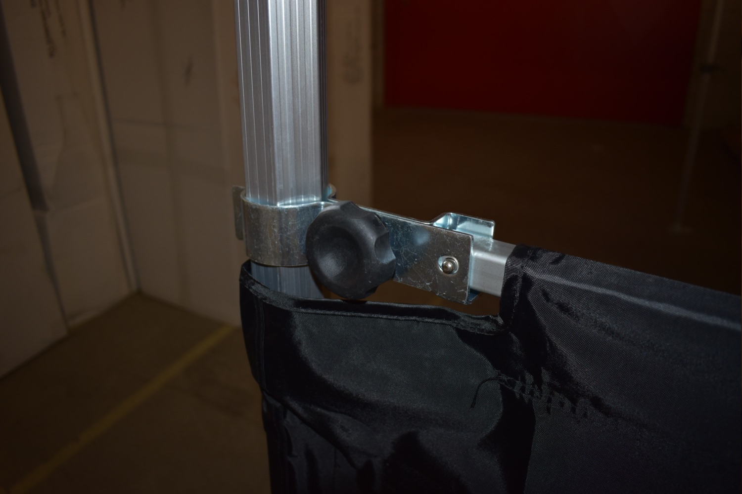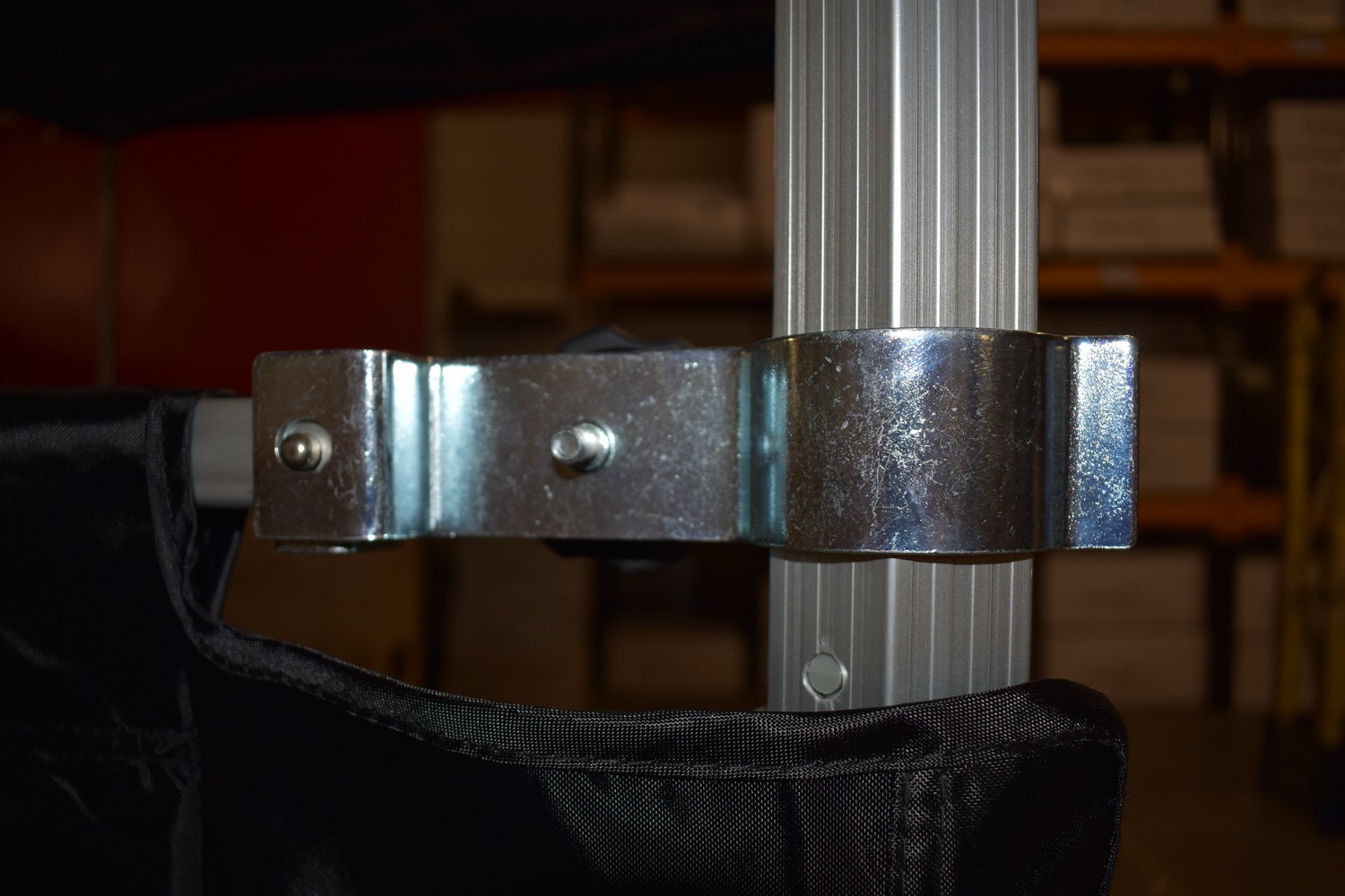 Met deze koppeling kun je 2 kokerprofielen vastzetten aan de een staander van de easy up tent. De ene kant wordt vastgezet aan de staanders van de easy up tent en tussen de gaten valt het kokerprofiel. De hoogte is flexibel en zelf in te stellen.
