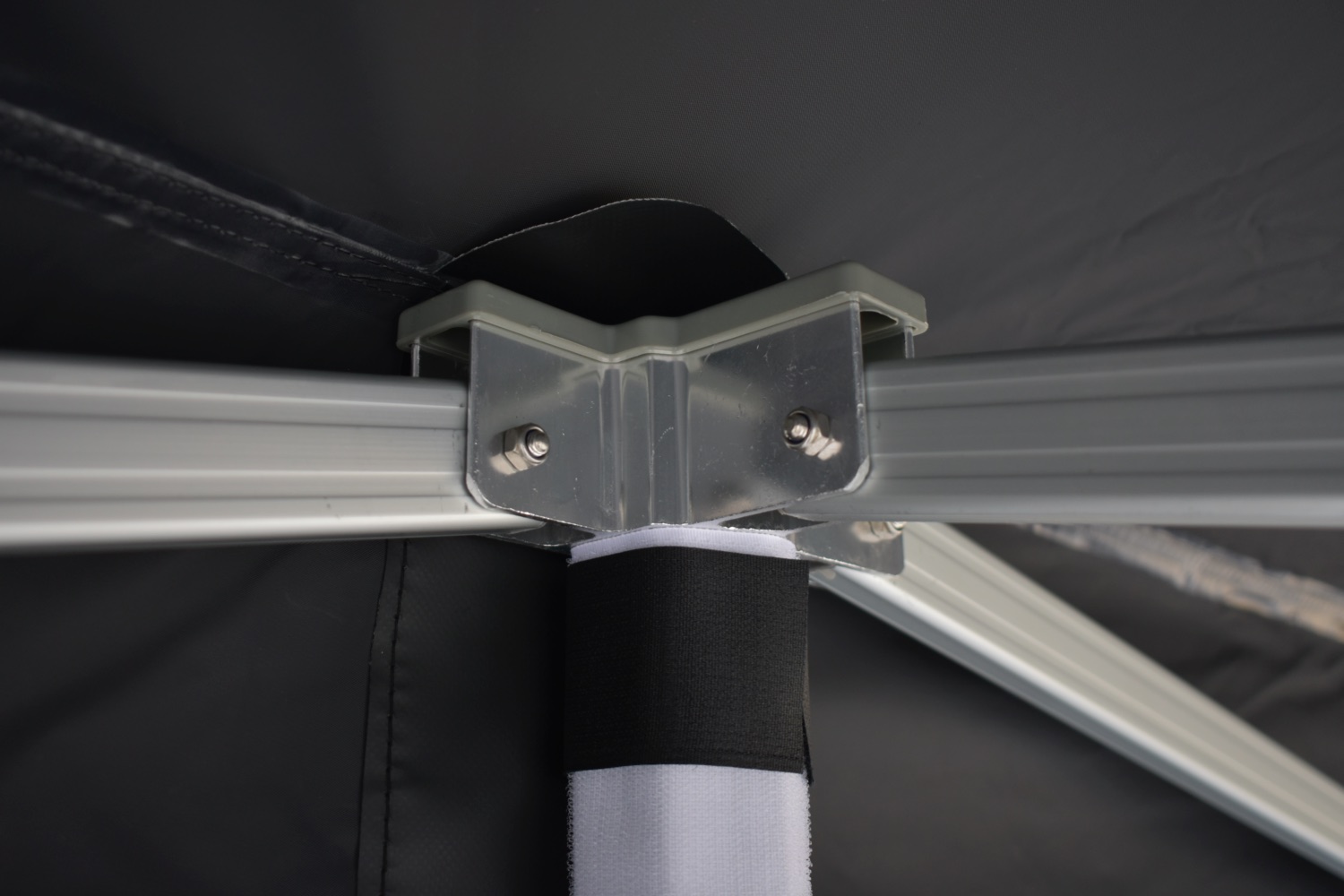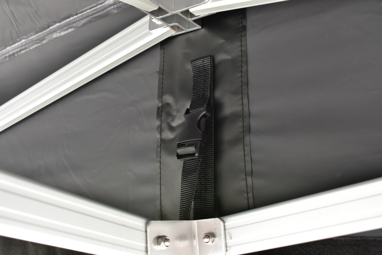 Het opzetten van deze tent is eenvoudig en veilig dankzij het schaarmechanisme en handige kliksystemen. Alle koppelingen en scharen zijn stevig bevestigd met hoogwaardige RVS bouten en borgmoeren. Bovendien blijft het dakzeil strak gespannen dankzij de hoogwaardige stalen veer tussen de steunpalen. De dakondersteuning is extra verstevigd en voorzien van een beschermende plastic kap, waardoor de tent bestand is tegen zelfs de ruwste omstandigheden.