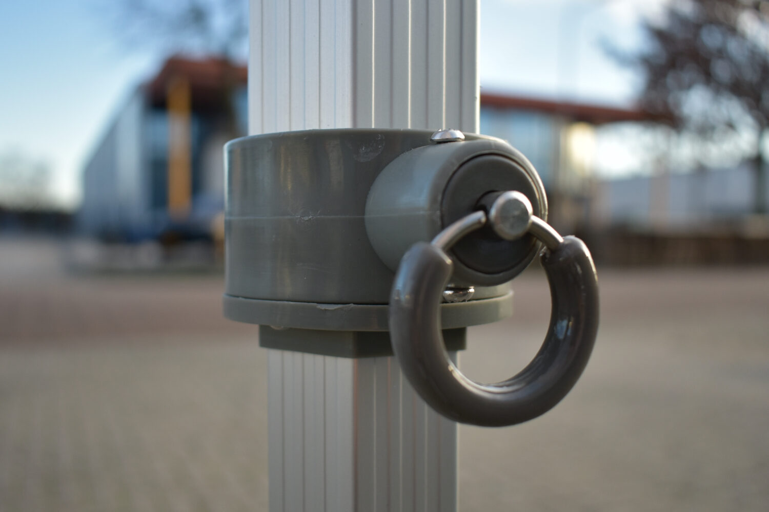 Veilige bediening van de bewegende mechanismen, zoals de trekring met kunststof bescherming en handige gespen aan het dakzeil