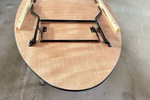 De ovale klaptafel is een uniek klaptafel. Erg mooi als tijdelijke vergadertafel, kantinetafel of bij een bruiloft. De klaptafel heeft een zwart onderstel en een 18mm multiplex tafelblad met een aluminium stootrand.