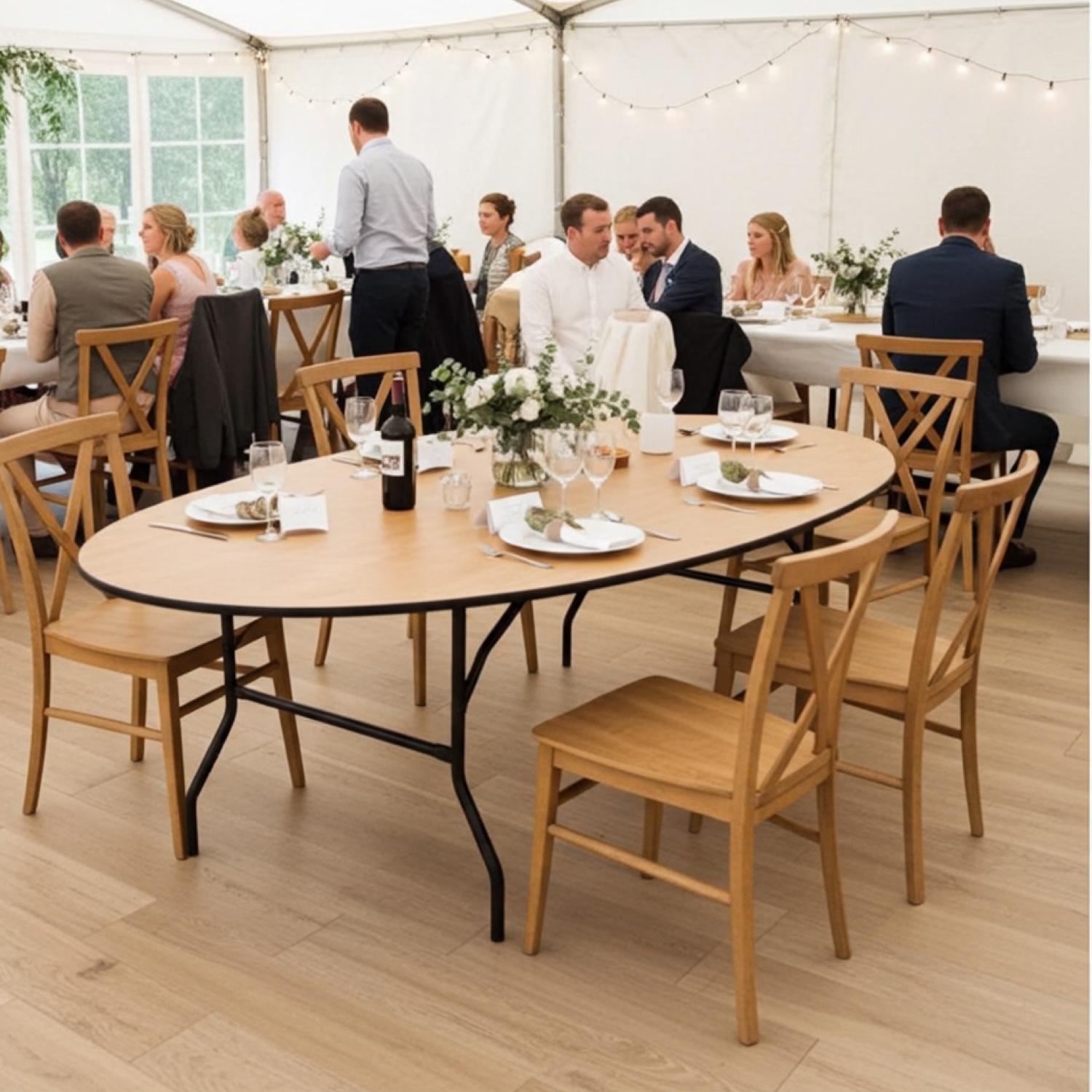 Deze ovale klaptafel is een stijlvolle en functionele tafel voor uiteenlopende toepassingen. Door de ovale vorm oogt de tafel vriendelijk en ruimtelijk, wat hem bijzonder geschikt maakt als tijdelijke vergadertafel, kantinetafel, dinertafel of als onderdeel van een bruilofts- of evenementopstelling.