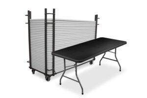 De klaptafel is gemaakt van een HDPE Blad dat uit 1 geheel is gegoten. Door de handige uitsparingen in het blad past het onderstel hier binnenin. De klaptafel beschikt over een zwart gelakt stalen frame met een extra verstevigings stang binnenin het blad, hierdoor is deze tafel vele malen steviger dan soortgelijke varianten. Deze klaptafel is zowel geschikt voor buiten als binnengebruik. Ook voor deze klaptafel is er een trolley beschikbaar waar er 30 stuks op passen. Deze klaptafel is niet vouwbaar in het midden. Een scharnier in het midden neemt teveel stevigheid weg.
