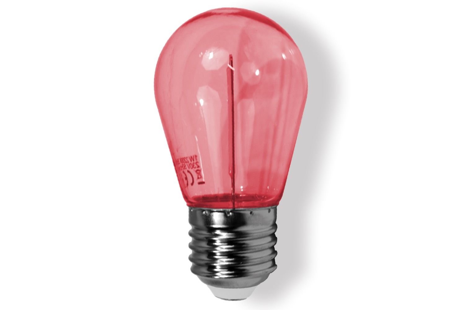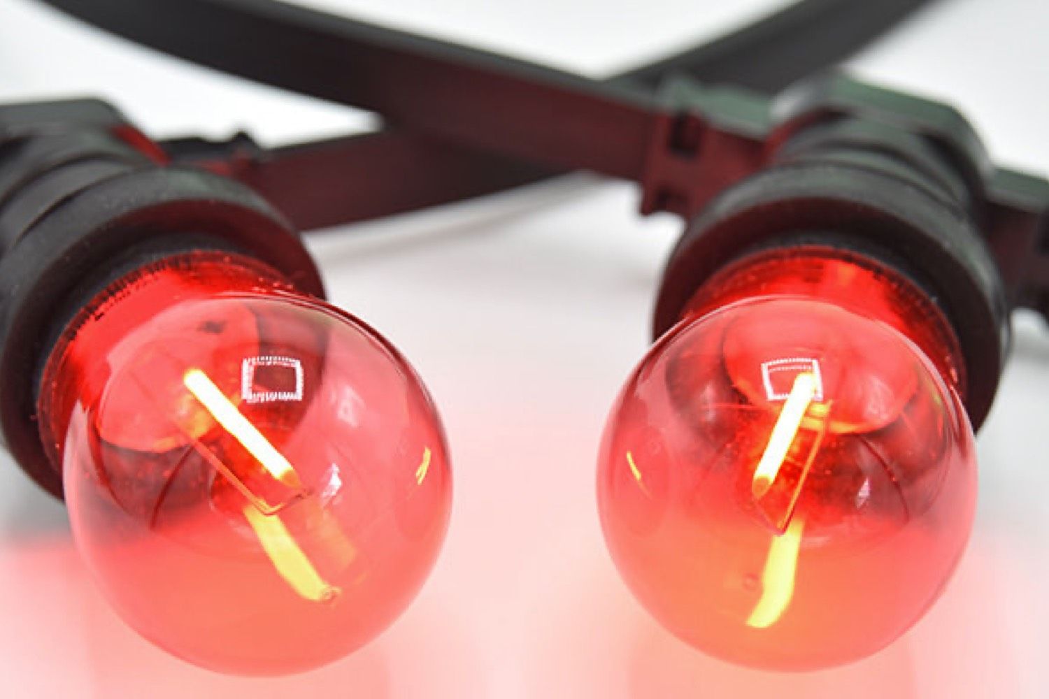 De filament in de lamp, het verticale streepje, straalt zelf rood licht uit. Hierdoor komt de lichtkleur rood mooi tot zijn recht. Bij andere aanbieders zie je dat ze bij gekleurde filament lampen warm witte LEDs gebruiken en dat de kleur rood wordt gecreëerd door enkel een rode kap. Bij die lampen is de kleur rood veel minder vol van kleur.