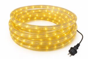 Deze prachtige LED lichtslang is veelzijdig inzetbaar, zowel binnen als buiten. De gele lichtslang (neigt ook een beetje naar oranje) creëert een sfeervolle ambiance. Met 36 LED-lampjes per meter en een onderlinge afstand van 2,75 cm tussen de LEDs, biedt de lichtslang een heldere en gelijkmatige verlichting. Dankzij de flexibiliteit van de slang kun je hem eenvoudig buigen en vormen, waardoor hij perfect is voor diverse toepassingen, zoals tuinverlichting, kerstdecoratie en terrasverlichting. Bovendien is deze lichtslang ontworpen om het hele jaar door te gebruiken, zowel in de zomer als in de winter, waardoor je altijd kunt genieten van zijn warme gloed.