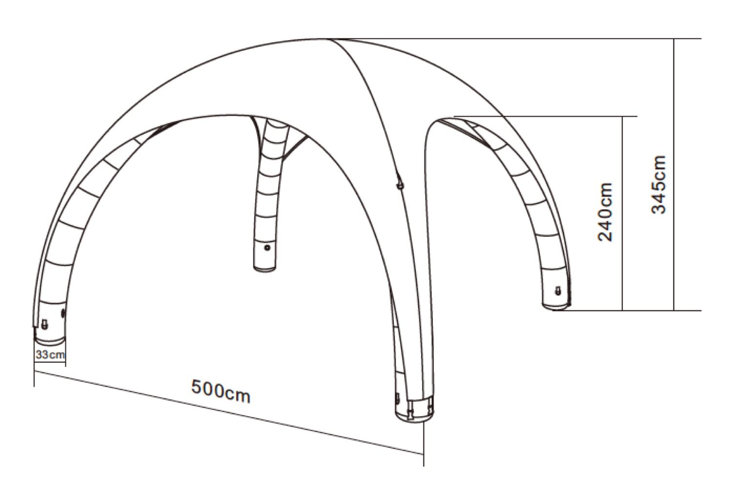 Het dak wordt vastgeritst aan het frame. Eventueel is het frame dus uit te wisselen met meerdere geprinte daken. De optionele luifel biedt een mooie gelegenheid als entree. De banner kan uiteraard ook volledig bedrukt worden. De boog vooraan de luifel wordt tegelijkertijd met het frame opgeblazen.