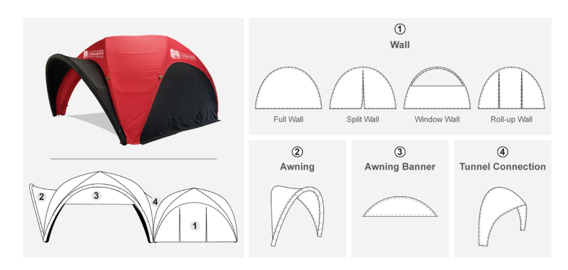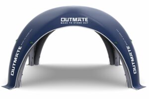Het innovatieve ontwerp maakt het mogelijk het dak snel en eenvoudig aan het frame te bevestigen, waardoor je de flexibiliteit hebt om te wisselen tussen verschillende bedrukte daken. Onze optionele luifel biedt niet alleen een elegante entree, maar kan ook volledig worden gepersonaliseerd met jouw branding. De boog van de luifel en het frame worden simultaan opgeblazen voor maximale efficiëntie.