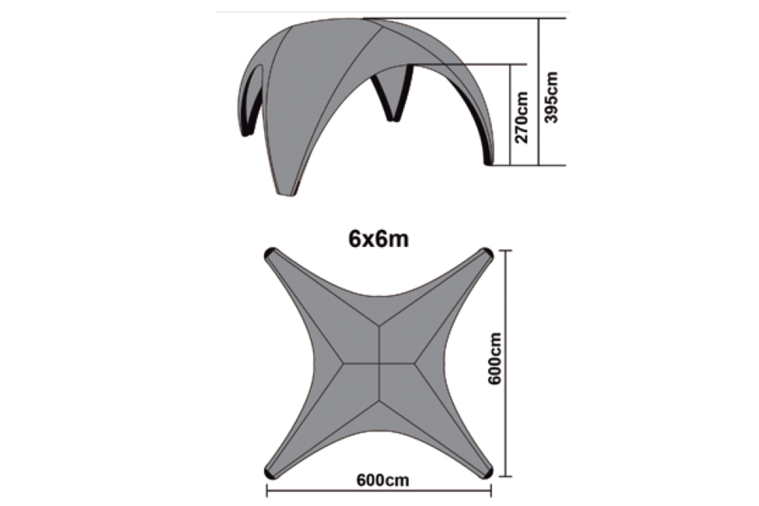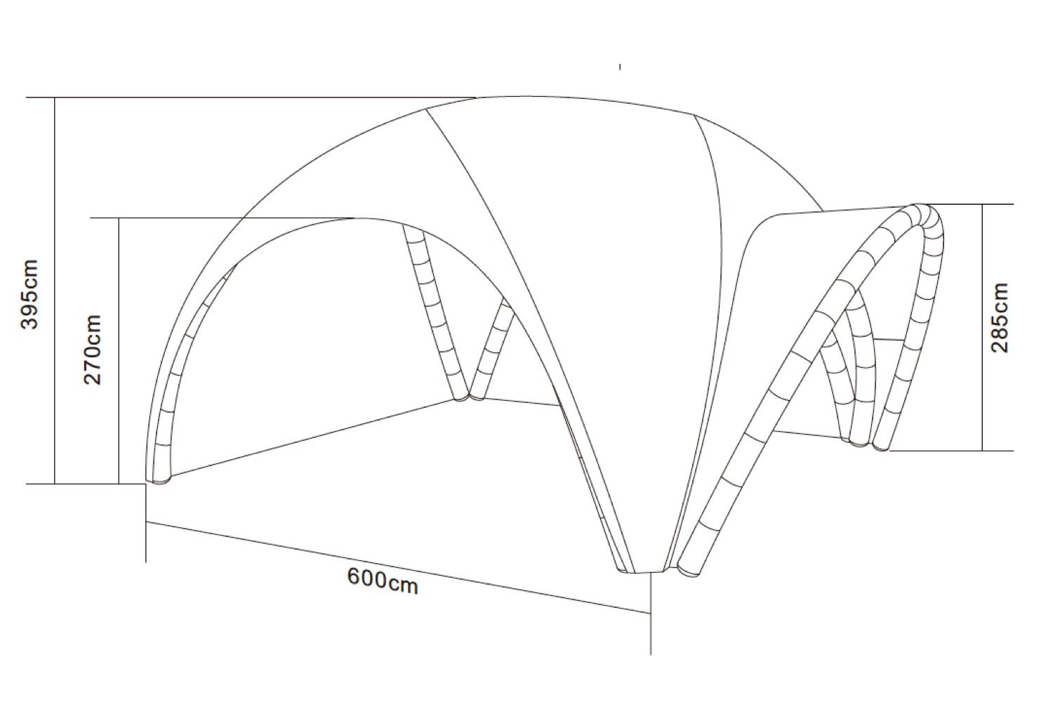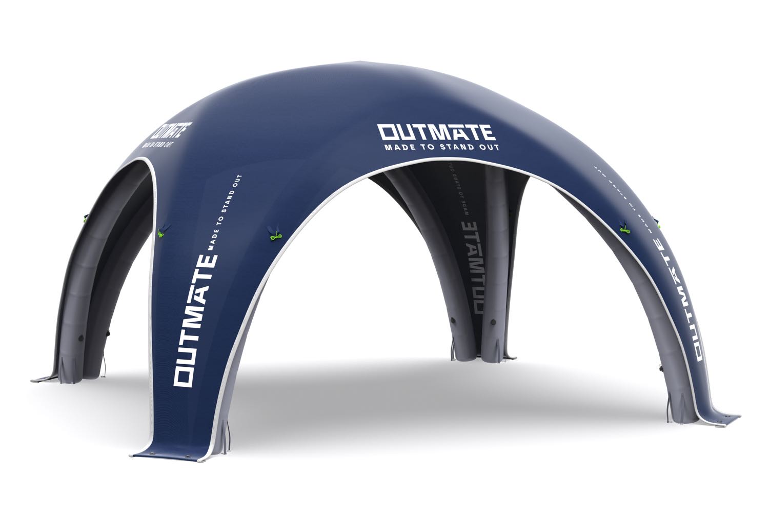 Het dak wordt vastgeritst aan het frame. Eventueel is het frame dus uit te wisselen met meerdere geprinte daken. De optionele luifel biedt een mooie gelegenheid als entree. De banner kan uiteraard ook volledig bedrukt worden. De boog vooraan de luifel wordt tegelijkertijd met het frame opgeblazen.
