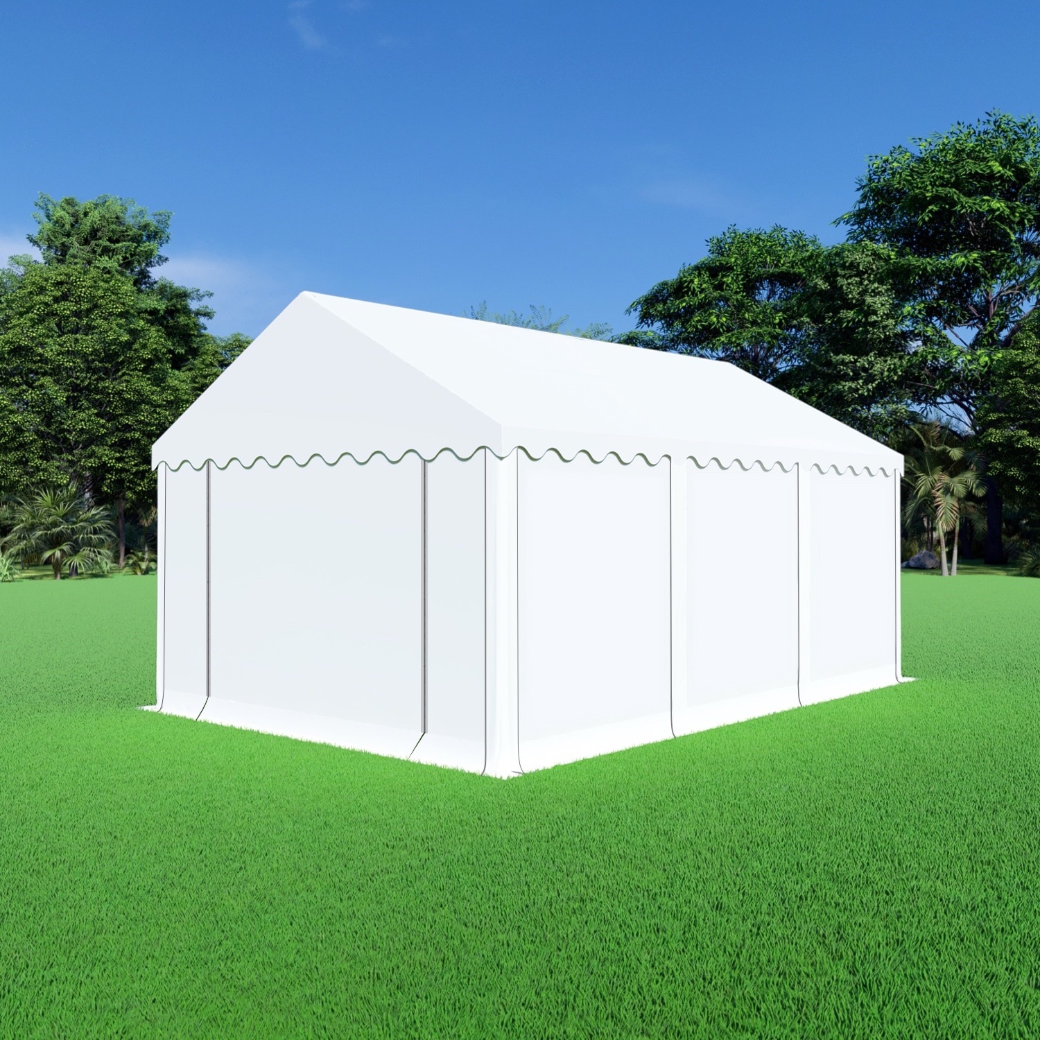De opslagt van 4 meter breed en 6 meter lang heeft een totaaloppervlakte van 24m². Zeer geschikte afmeting voor opritten of tuinen. De professional PVC is uitermate geschikt om langere tijd achtereen opgesteld te blijven staan. De partytent 4×6 professional beschikt over een grondframe en nokversteviging en extra dikke zeilen van 620 gram per m².