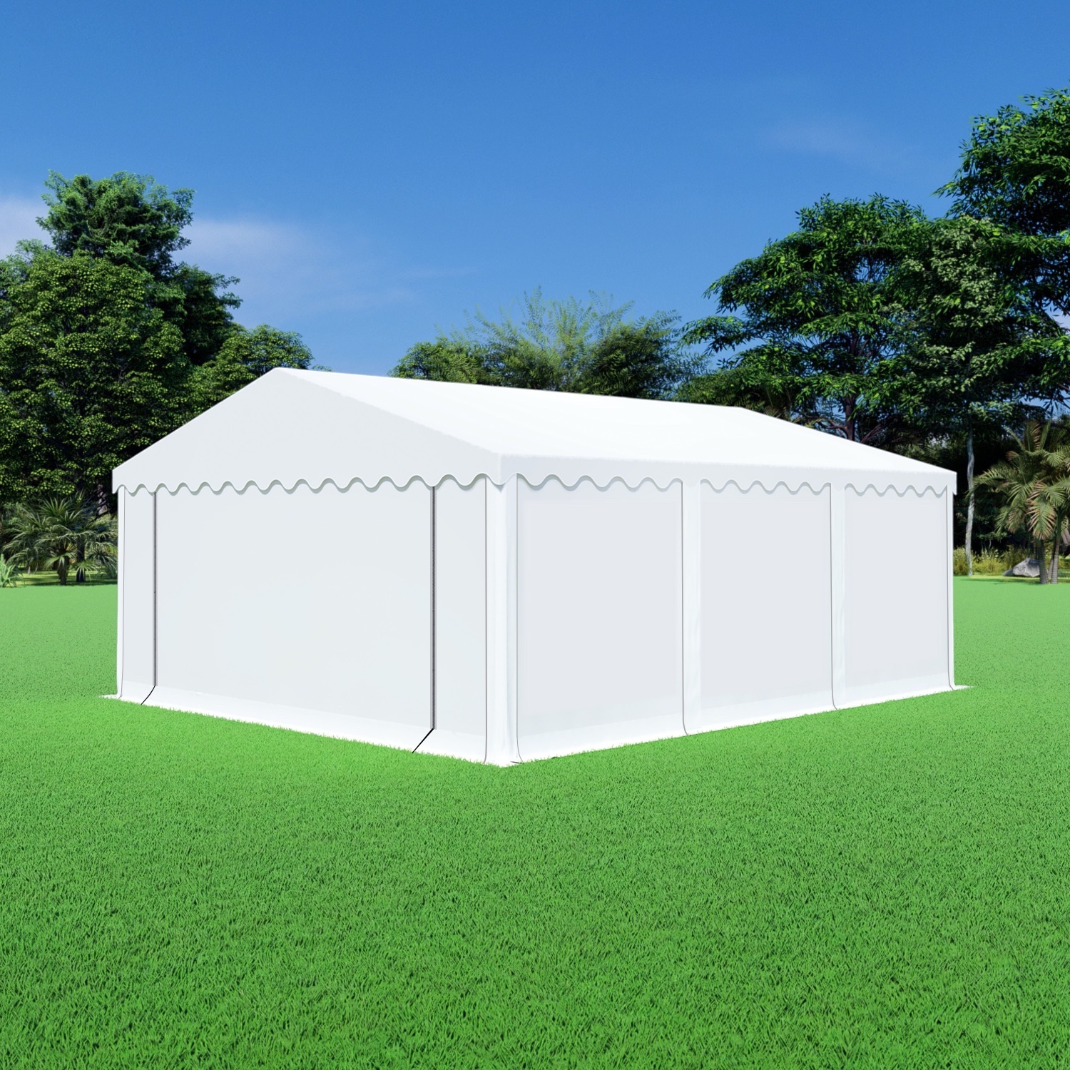 De opslagtent is 5 meter breed en 6 meter lang. Deze opslagtent heeft een totaaloppervlakte van 30m² en beschikt over stevige PVC zeilen van 550 gram/m² en een uitgebreid frame met een grondframe en nokversteviging.