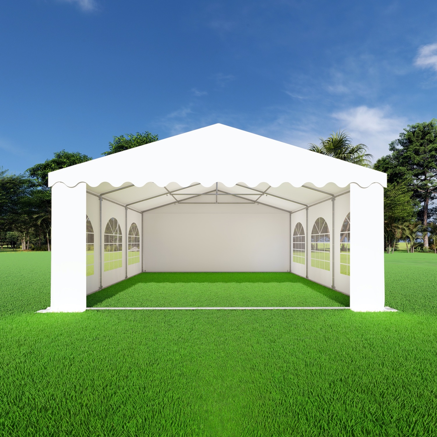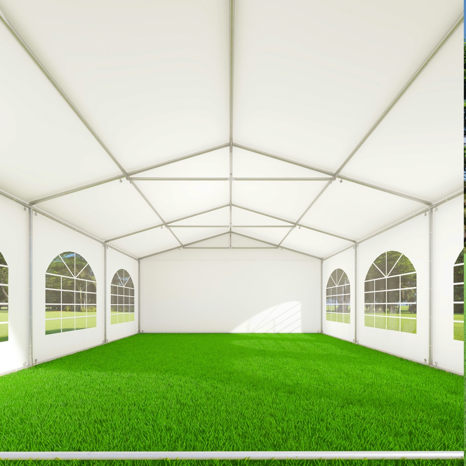 De eindwanden hebben beide ritsen in het zeil waarmee een oproldeur kan worden gemaakt die bovenaan kan worden vastgezet. Zowel de eindwanden als zijwanden hebben oogringen volledig rondom om deze te bevestigen en verankeren en beschikken over een 30cm lange tochtflap aan de onderkant om regen, wind en vuil te weren.