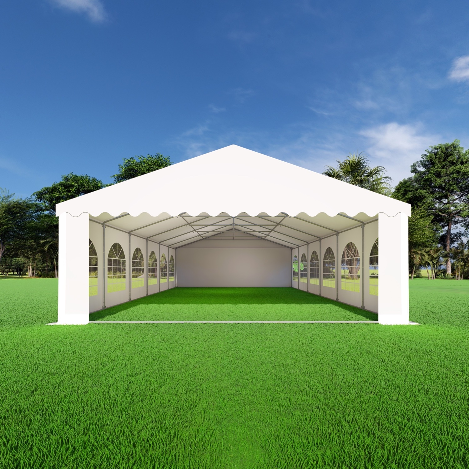 De opslagtent 6×12 PVC Premium heeft 2 eindwanden met deur. Beide eindwanden beschikken over een verschillende afmeting deur, zie extra informatie voor de afmetingen van de deur. De deuren worden gemaakt door de ritsen te openen, het zeil op te rollen en vast te zetten.