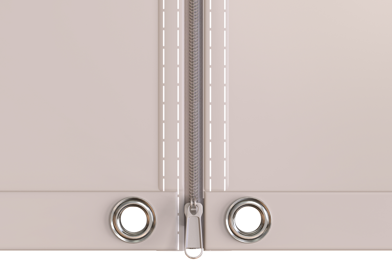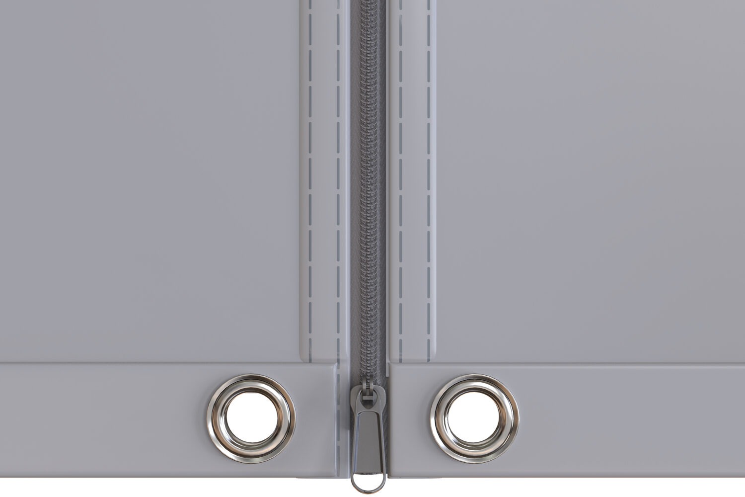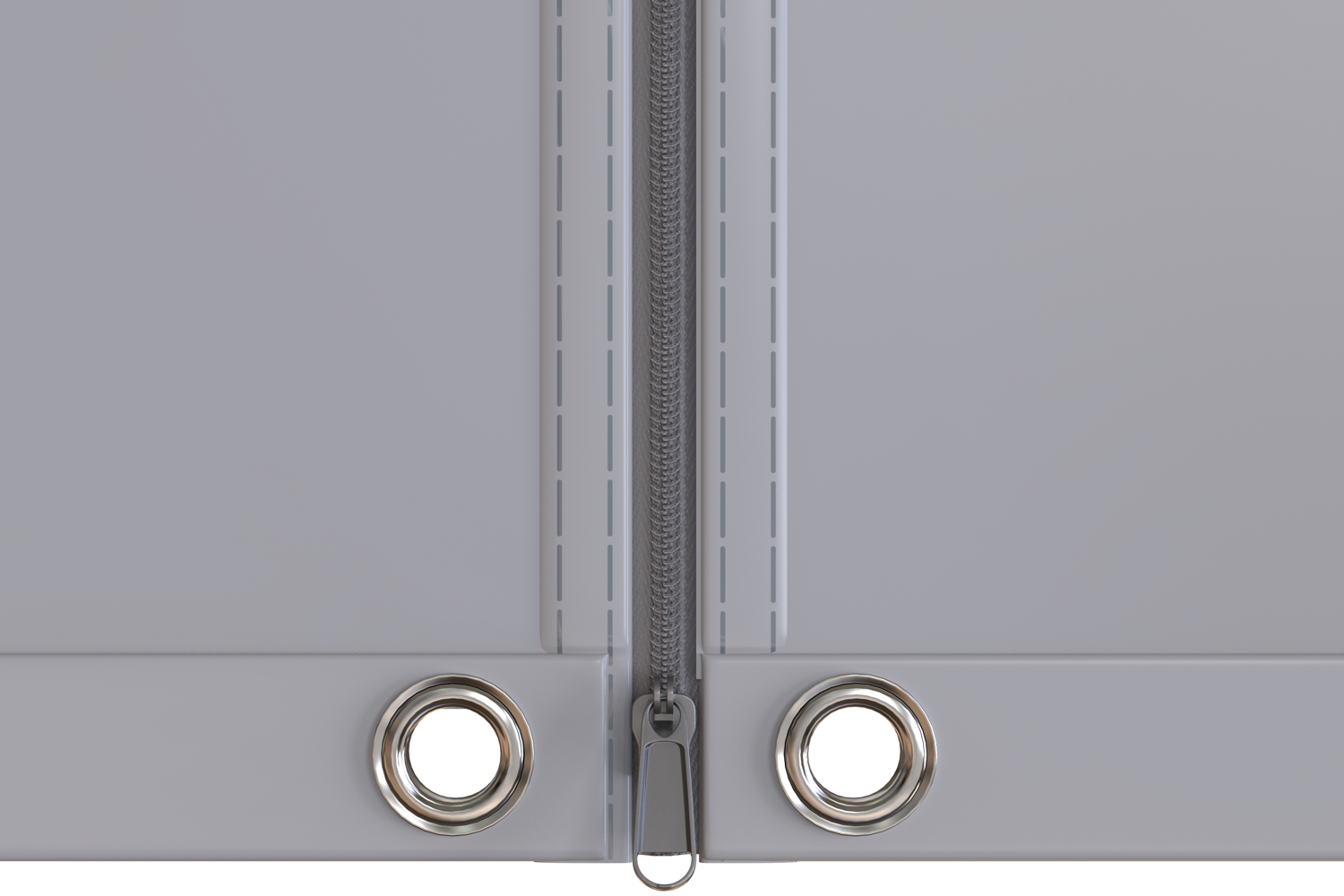 Er zitten 2 stevige ritsen in dit zeil, aan beide kanten van het raam een rits. Deze ritsen kunnen 225cm geopend worden en hiermee kan het raamgedeelte worden opgerold en bovenaan vastgezet. Het raam is 195cm breed en 115cm hoog en bevind zich op +-110cm vanaf de onderkant van het zeil