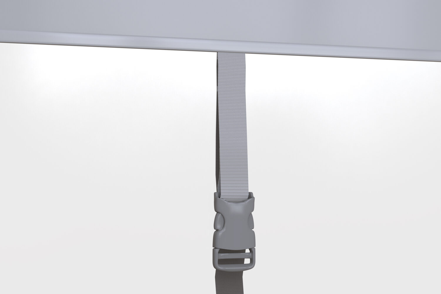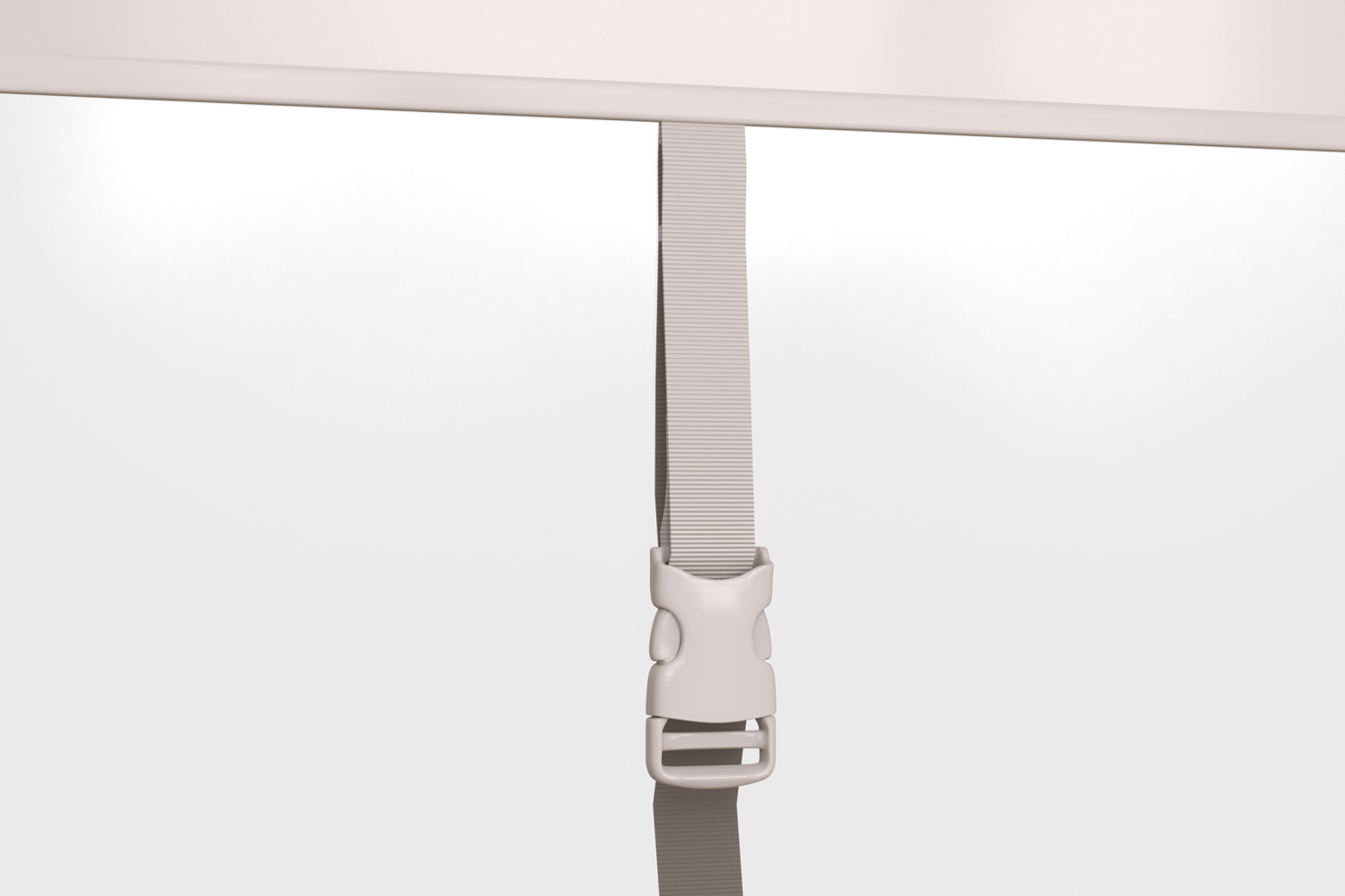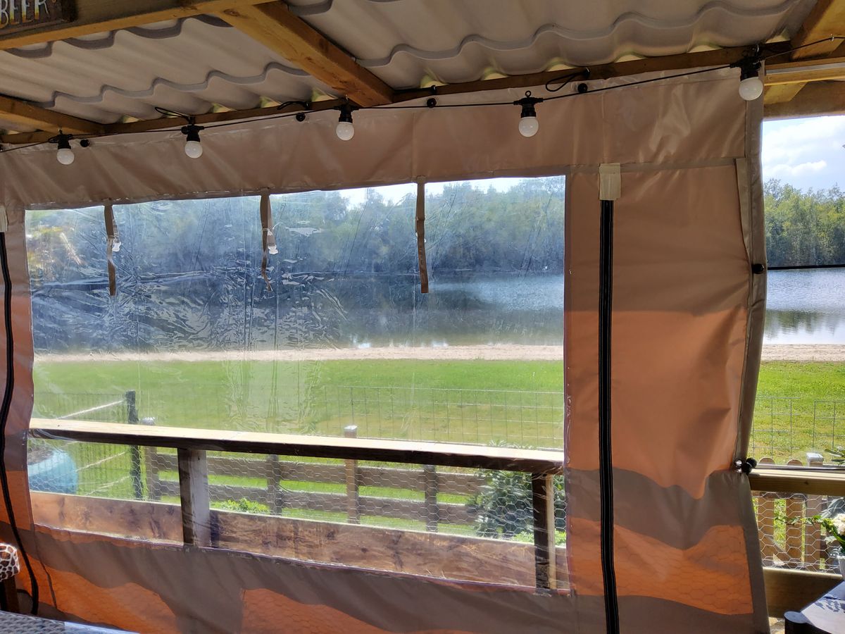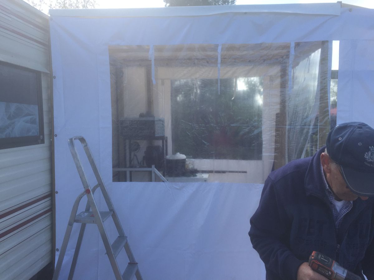 Er zitten 2 stevige ritsen in dit zeil, aan beide kanten van het raam een rits. Deze ritsen kunnen 225cm geopend worden en hiermee kan het raamgedeelte worden opgerold en bovenaan vastgezet. Het raam is 195cm breed en 115cm hoog en bevind zich op +-110cm vanaf de onderkant van het zeil