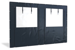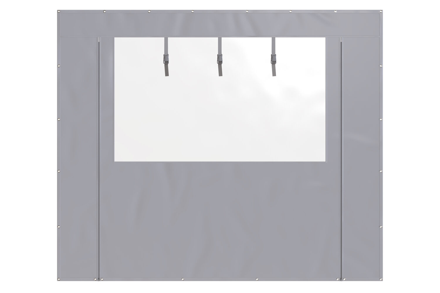 De zijwand voor overkapping en veranda's beschikt over een groot panorama raam in het midden van het zeil. Naast het raam zitten ritsen die je op kunt rollen om een oproldeur te creëren. Het zeil is gemaakt van 550gr/m², beschikt rondom over ronde oogringen en is in verschillende kleuren beschikbaar.