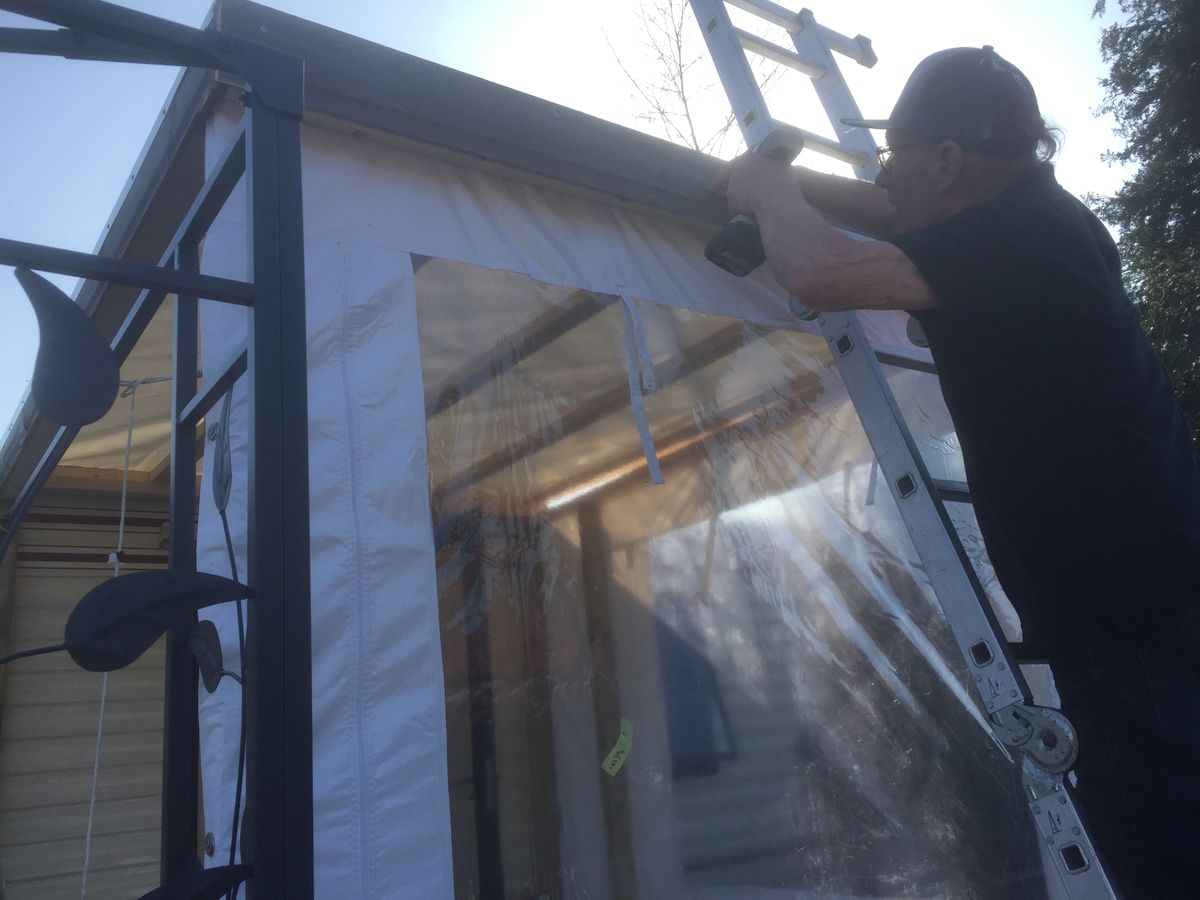 Romdom in het zeil zitten oogringen waarmee je het zeil kunt bevestigen aan de overkapping door middel van bijvoorbeeld schroeven met een plaatje ervoor of elastieken. Het zeil kan ook heel gemakkelijk met zelfklevend klittenband worden bevestigd aan bijvoorbeeld de houten staanders en liggers van een overkapping.