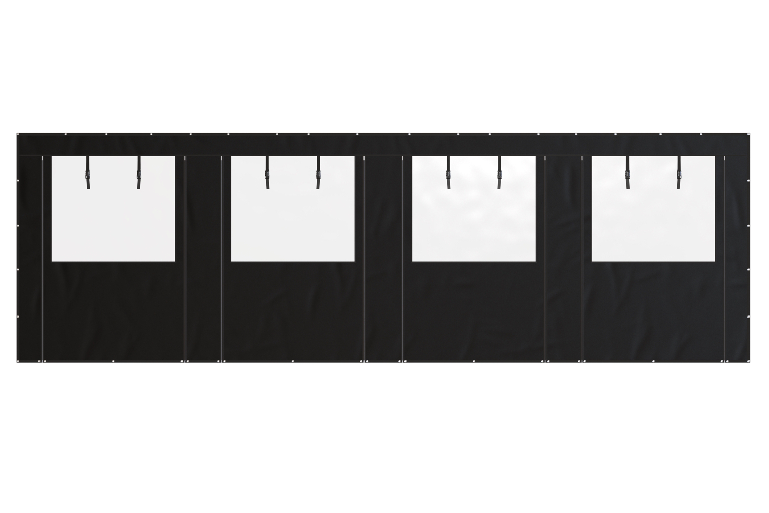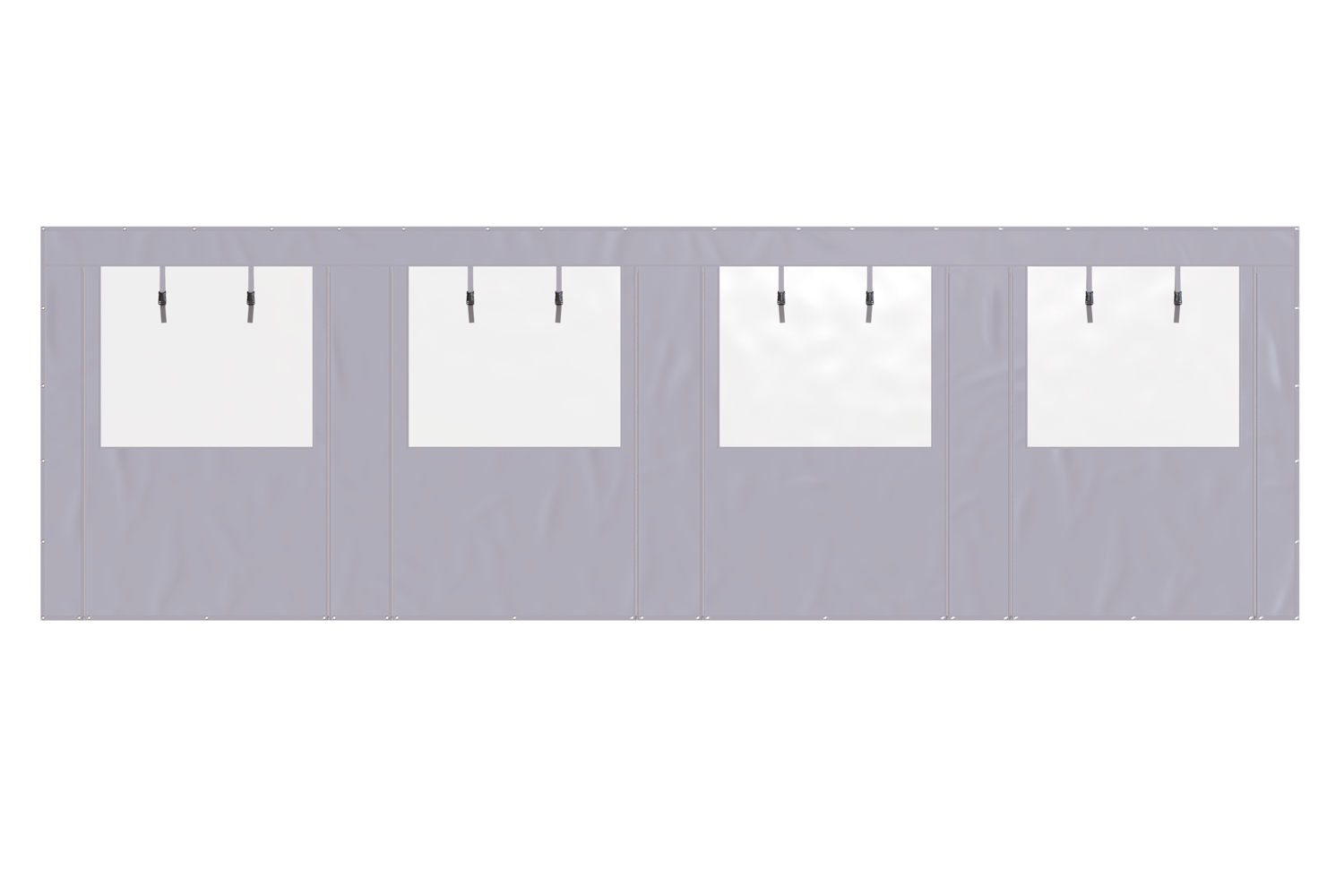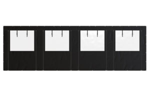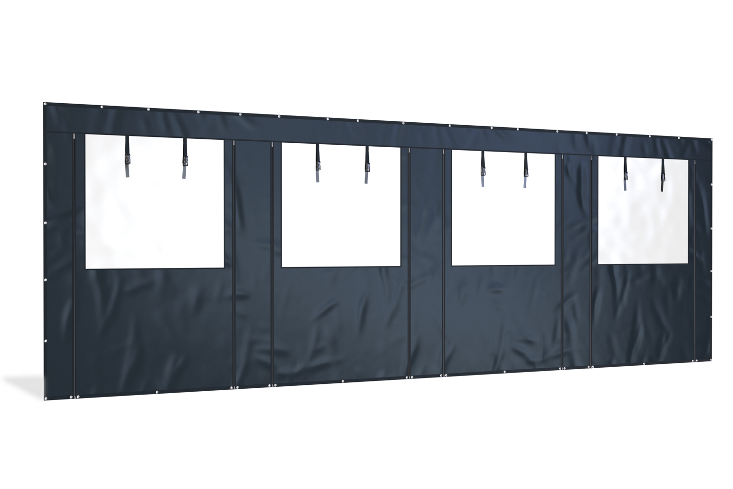 Dit zeil heeft 4 ramen van dik raamfolie met aan beide kanten van elk raam een rits om het gedeelte ertussen te kunnen oprollen. Het opgerolde gedeelte kan aan de bovenkant op 225cm worden vastgezet.