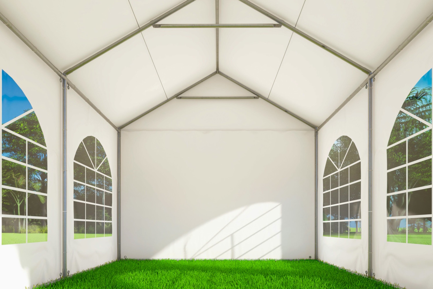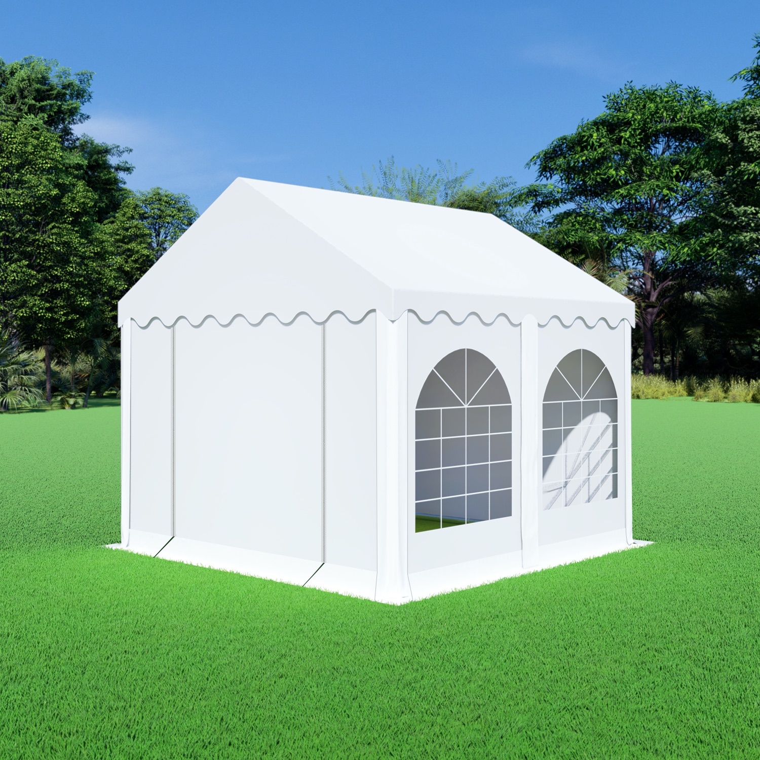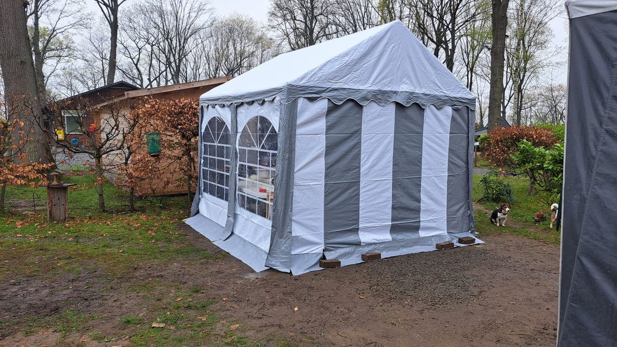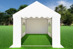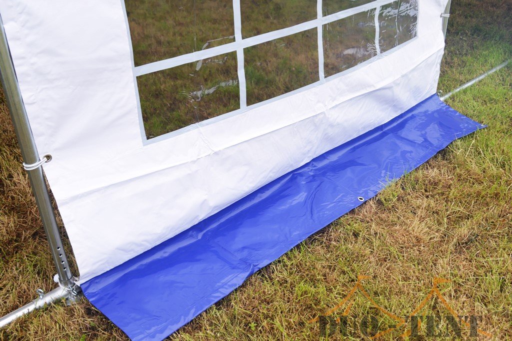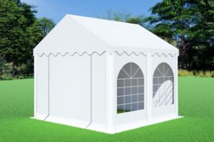 Het zeil van de premium variant partytent is gemaakt van PVC. Niet zomaar eentje, maar een dik zeil van 550 gram per m². Met dikke vensterfolie in de zijwanden met raam. Het dakzeil bestaat uit 1 geheel en heeft flappen aan het dakzeil om de naad tussen de zijwanden af te dichten. De partytent heeft totaal 4 zijwanden met raam en 2 eindwanden met ritsen. Van de eindwanden met ritsen kan een oproldeur worden gemaakt. Elk zeil heeft een tochtflap van 30cm onderaan. Hiermee wordt voorkomen dat de wind eronder komt. De zeilen van deze partytent 3×3 worden door de oogringen rondom bevestigd met elastieken met bol aan het frame. De eindwanden zet je rechtstreeks met elastieken vast aan het dakzeil.