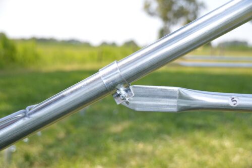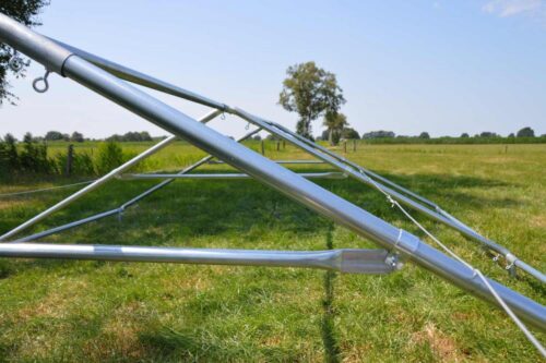 Het frame van de 4×6 PVC partytent is zowel aan de binnen- als buitenzijde gegalvaniseerd en bestaat uit buizen met een diameter van 38 mm en een dikte van 1,2 mm. De koppelstukken hebben een diameter van 42 mm en passen perfect op de buizen. De buizen worden stevig op hun plaats gehouden door middel van oogbouten. Bovendien is het frame uitgerust met een grondbuis en nokversteviging door een extra dwarsligger, wat de stabiliteit aanzienlijk verhoogt.