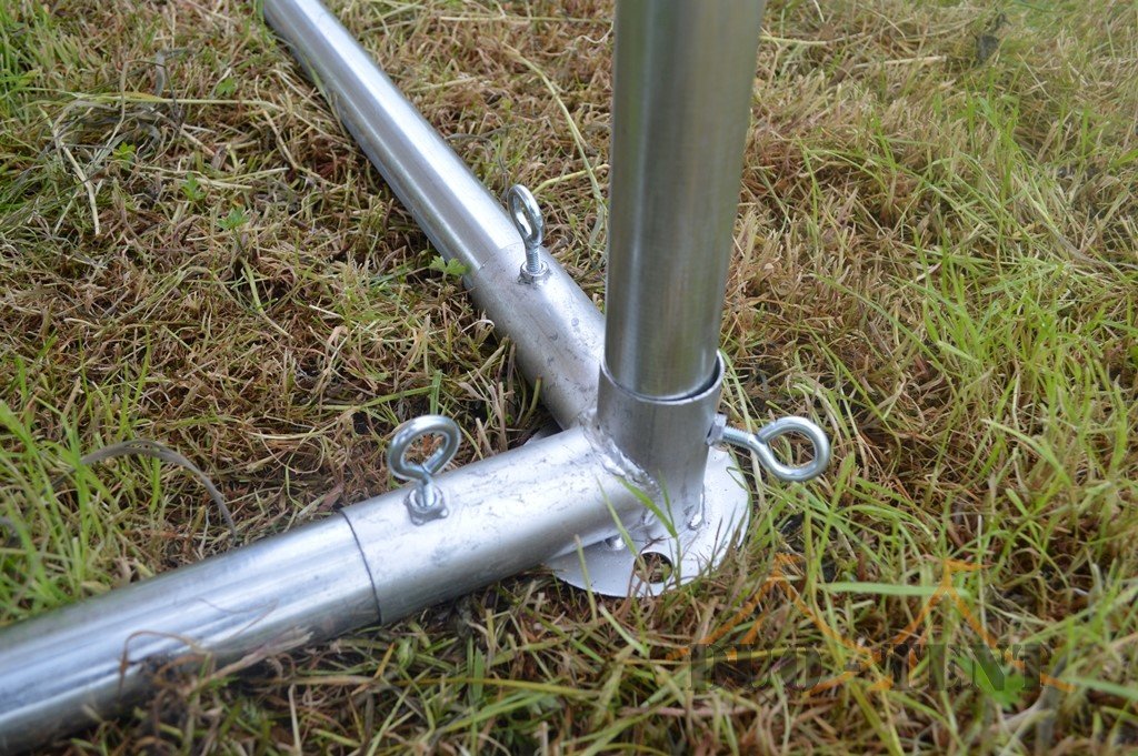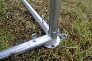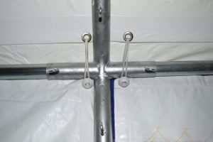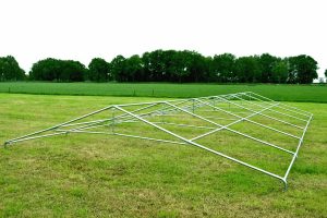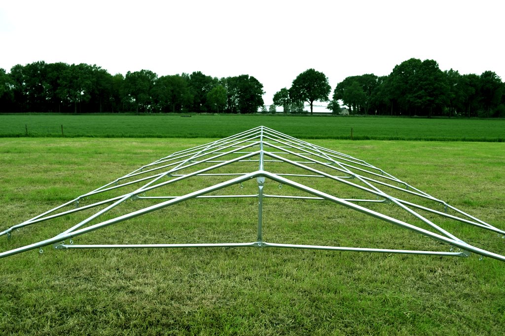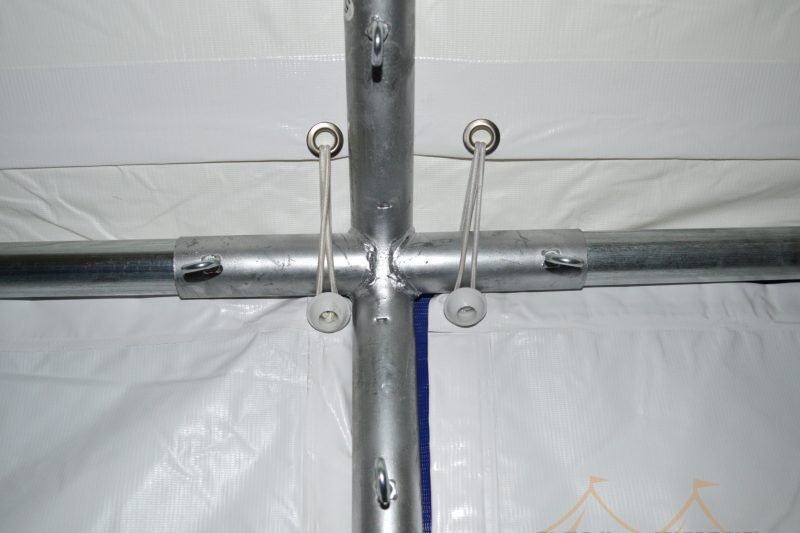 De partytent 5×10 pvc partytent heeft een van binnen en buiten gegalvaniseerd buizenframe. Zowel de koppelstukken als de buizen zijn van binnen en van buiten gegalvaniseerd. De buizen hebben een diameter van 38mm en zijn 1.2mm dik. De koppelstukken zijn ⌀42mm met een perfecte pasvorm voor de buizen. De buizen worden door middel van de oogbouten in de koppelstukken op zijn plaats gehouden. Het frame beschikt hiernaast over een grondbuis en nokversteviging door middel van een extra dwarsligger, dit verhoogt de stabiliteit enorm!