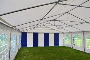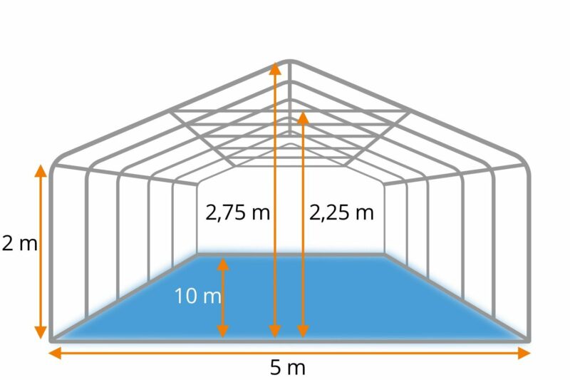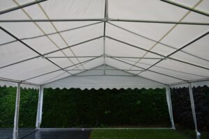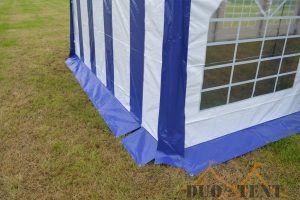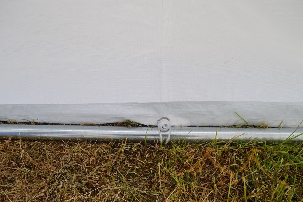 Doordat de zeilen van 550 gram per m² PVC gemaakt zijn kun je rustig spreken van uitermate goede kwaliteit zeilen. Zowel het dakzeil, zijwanden en de eindwanden zijn gemaakt van deze kwaliteit PVC zeilen. Het dakzeil is uit een geheel en heeft bij elke staander een flap naar beneden om de naad tussen de zijkantzeilen af te dichten. De eindwanden beschikken elk over ritsen waarmee een handige oproldeur gemaakt kan worden. De zeilen worden aan het frame vastgemaakt met de bijgeleverde elastieken met bol. De partytent 5×10 Premium PVC beschikt over 10 zijwanden met raam en 2 eindwanden met ritsen. Elk zeil heeft een tochtflap aan de onderkant van 30cm om vuil, regen en tocht buiten de tent te houden.