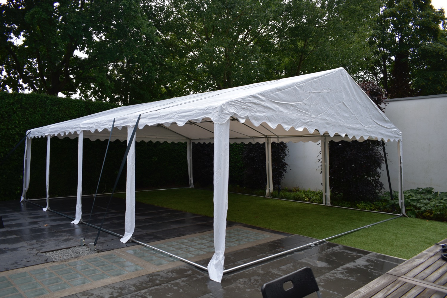 Het opzetten van de partytent is, met de opzet instructie in de hand niet al te moeilijk. Het zal voor de eerste keer ongeveer 2 tot 3 uur in beslag nemen.
