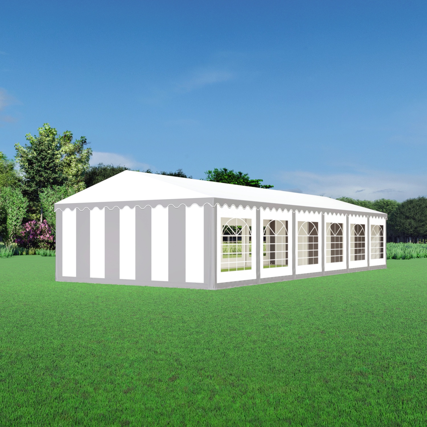 Sterke PVC partytent met een eenvoudig op te zetten 38mm gegalvaniseerd buizenframe en zeilen van brandvertragend PVC met thermisch gelaste naden.