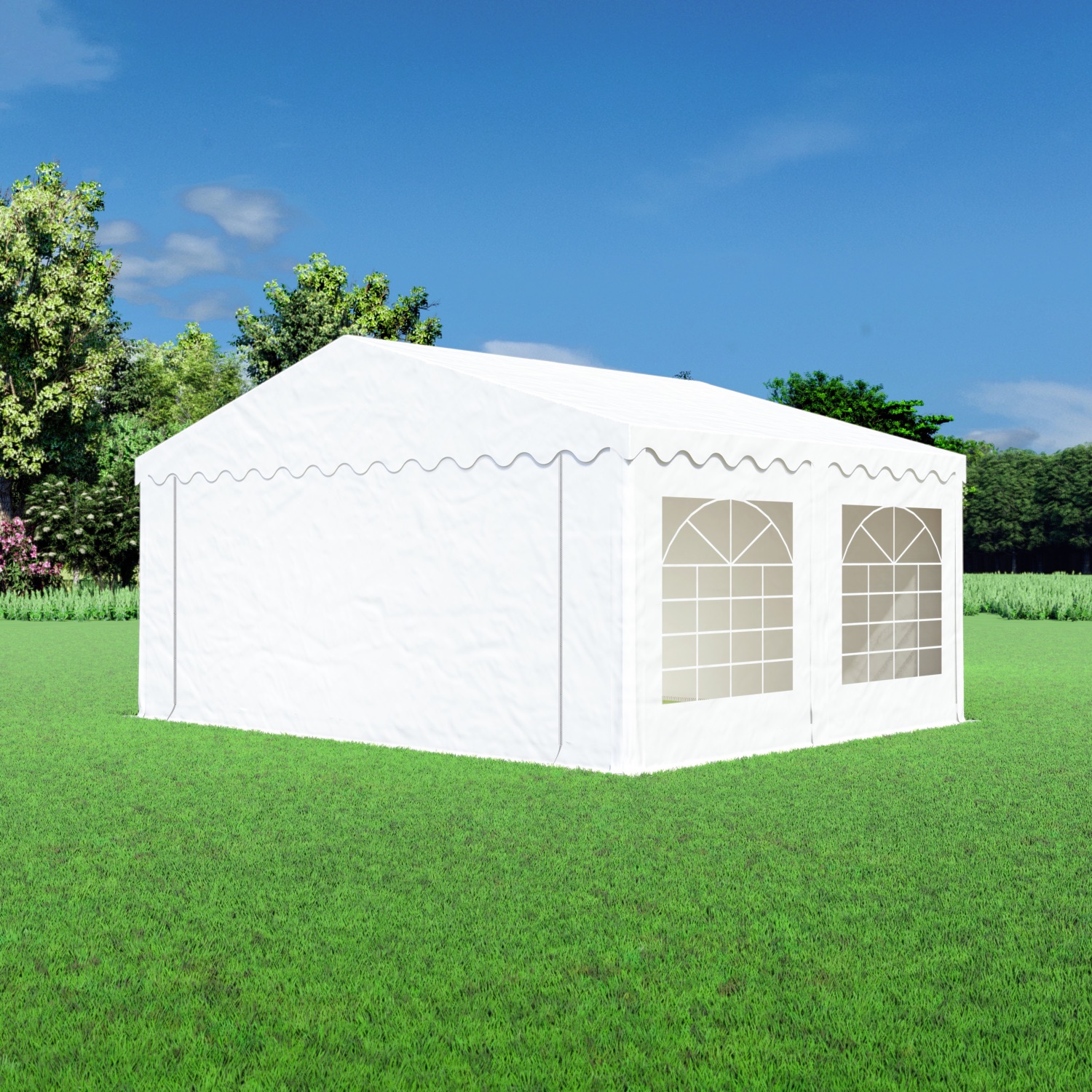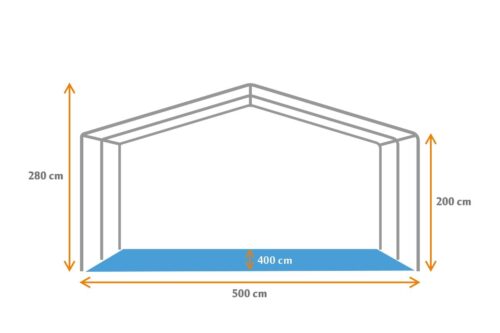 Het PVC zeil is 500 gram per m² brandvertragend, Uv-bestendig en 100% waterdicht. Een zwaar degelijk zeil dat een lange levensduur heeft. Rondom de zeilen zitten oogringen ter bevestiging aan het zeil. Het dakzeil heeft flappen die bij elke staander naar beneden komen om de naad tussen de zijkantzeilen af te dichten. De partytent 5×4 heeft 4 zijwanden van 2 meter met een mooi boogvenster raam en 2 eindwanden. Beide eindwanden hebben een oproldeur met sterke ritsen. De ene een brede, de ander een smalle deur.