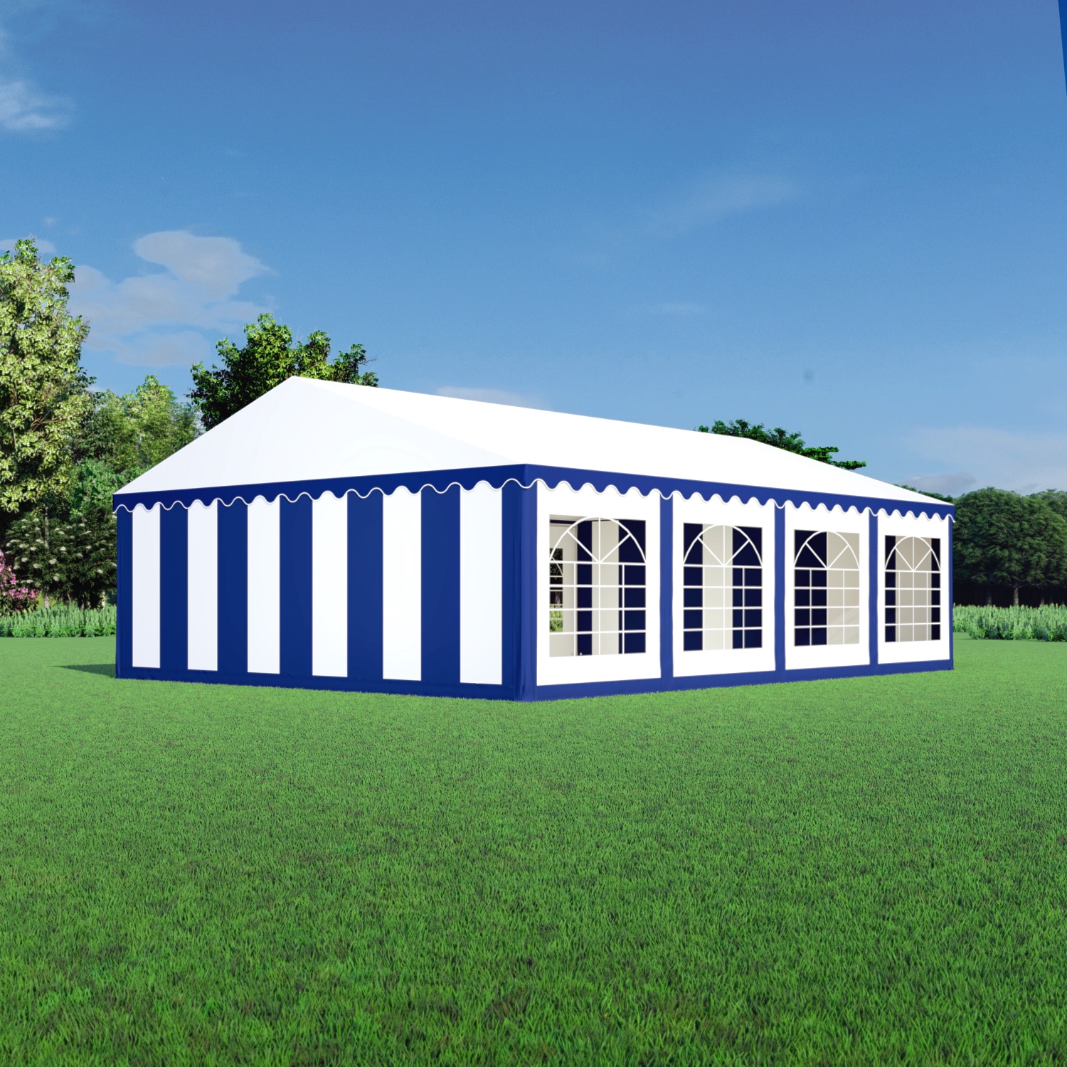 Sterke PVC partytent met een eenvoudig op te zetten 38mm gegalvaniseerd buizenframe en zeilen van brandvertragend PVC met thermisch gelaste naden.