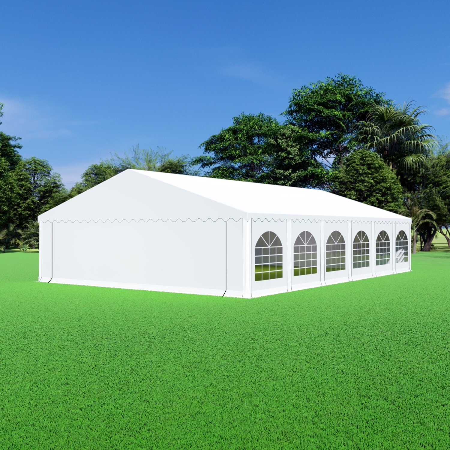 De zijwanden met raam, waarvan er 12 bij deze partytent aanwezig zijn, zijn ook gemaakt van PVC van 550 gram per m2. De mooie boogvensters zijn gemaakt van stevige vensterfolie dat mooi helder en veel licht doorlaat. Deze zijwanden hebben rondom oogringen en worden hiermee met sterke elastieken aan het frame vastgezet. De zijwanden hebben een extra tochtflap van 30cm onderaan om wind, vuil en water buiten de tent te houden.