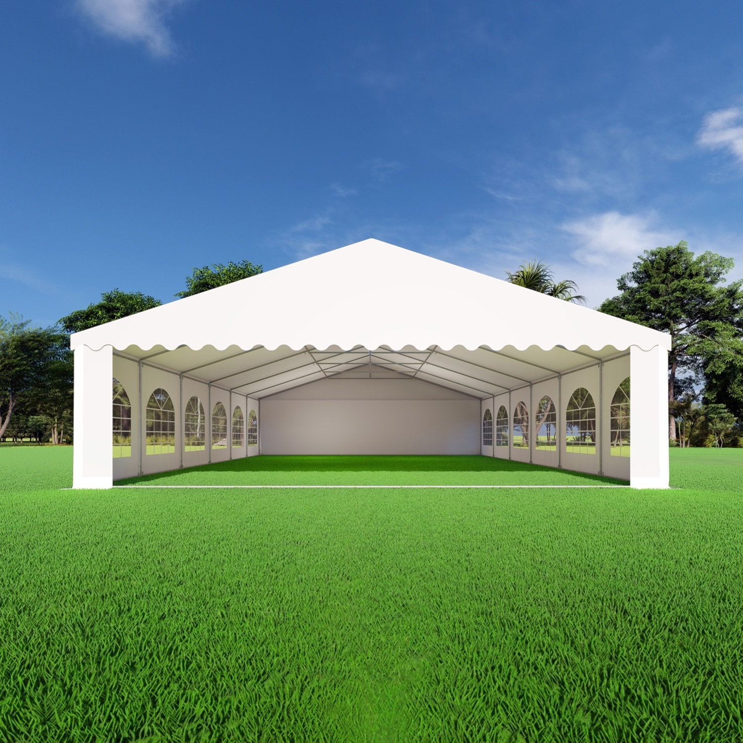 De partytent 8×12 PVC Premium heeft 2 eindwanden met deur. Beide eindwanden beschikken over een verschillende afmeting deur, zie extra informatie voor de afmetingen van de deur. De deuren worden gemaakt door de ritsen te openen, het zeil op te rollen en vast te zetten.