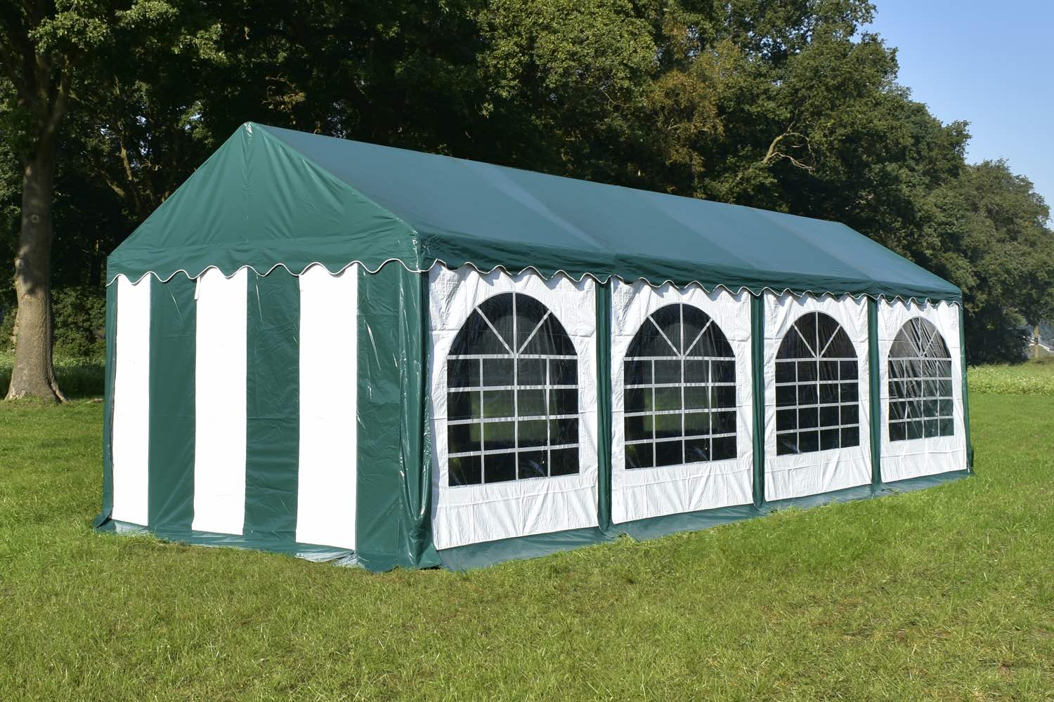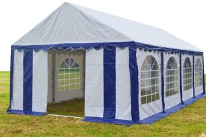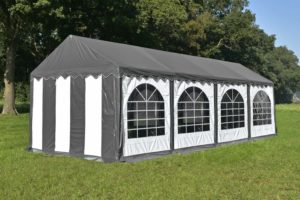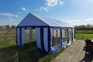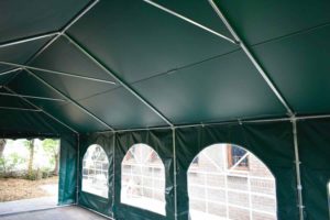 Het dakzeil van deze tent is van hoogwaardige kwaliteit en biedt verschillende voordelen. Het is brandvertragend gelabeld en vervaardigd uit 550 gram per m² PVC, wat zorgt voor een stevige en duurzame constructie. Daarnaast zijn er tochtflappen met klittenband bij elke staander voor extra bescherming, en metalen oogringen voor de bevestiging van elastieken. De naden zijn geseald in plaats van gestikt, wat de sterkte aanzienlijk vergroot. Het zeil is volledig UV-bestendig en 100% waterdicht, waardoor het uitermate geschikt is voor langdurig gebruik onder diverse weersomstandigheden.