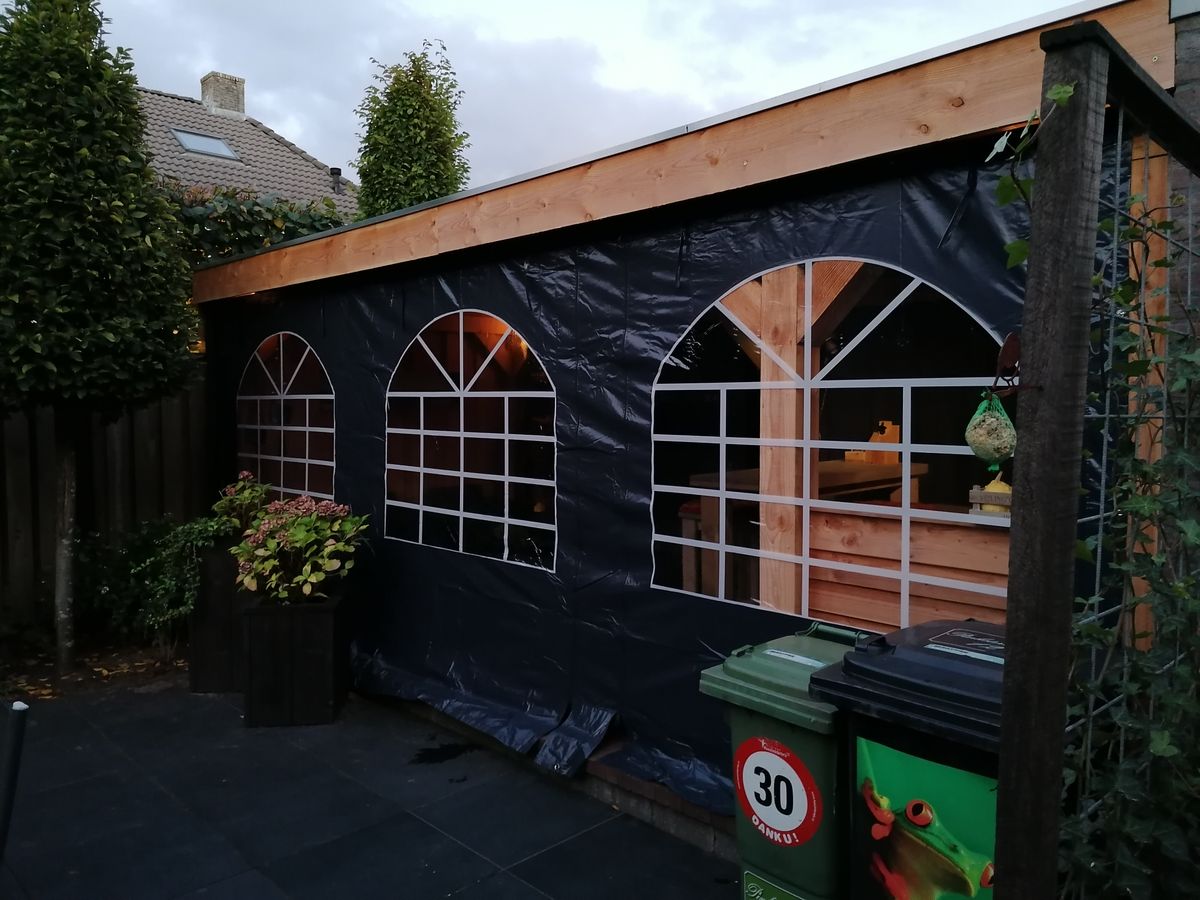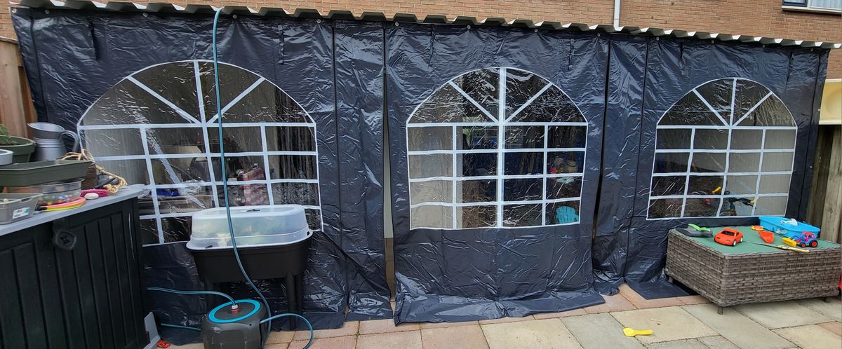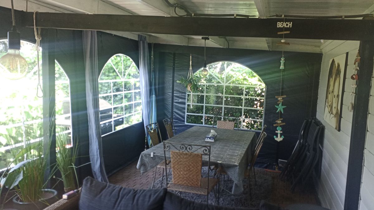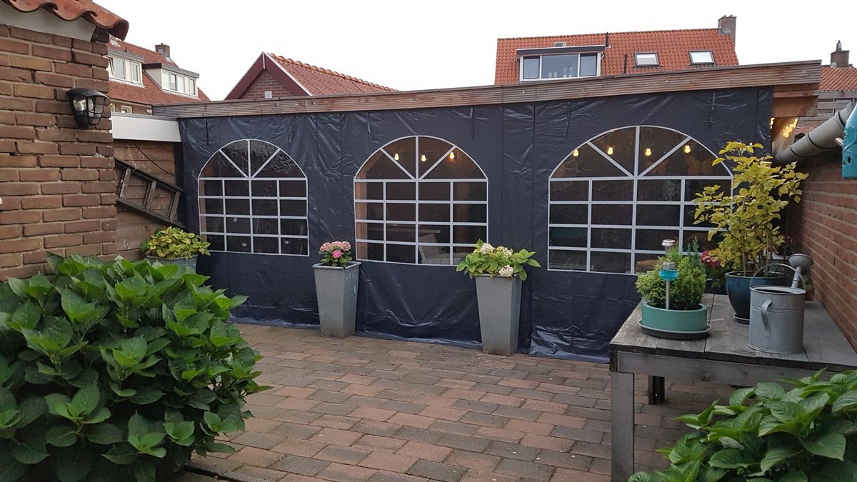 De zijwand heeft 3 ramen. Naast elk raam beschikt de zijwand over sterke ritsen waardoor je het raam kunt oprollen en bovenaan kunt vastzetten. Handig in lente en zomer.