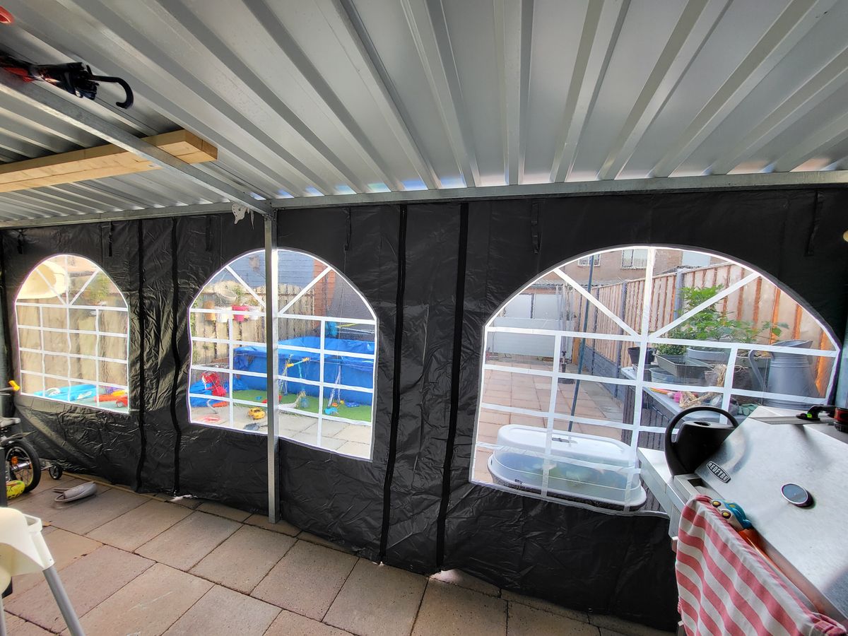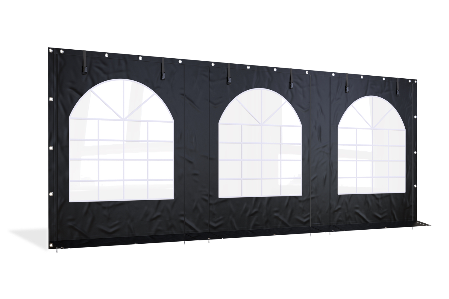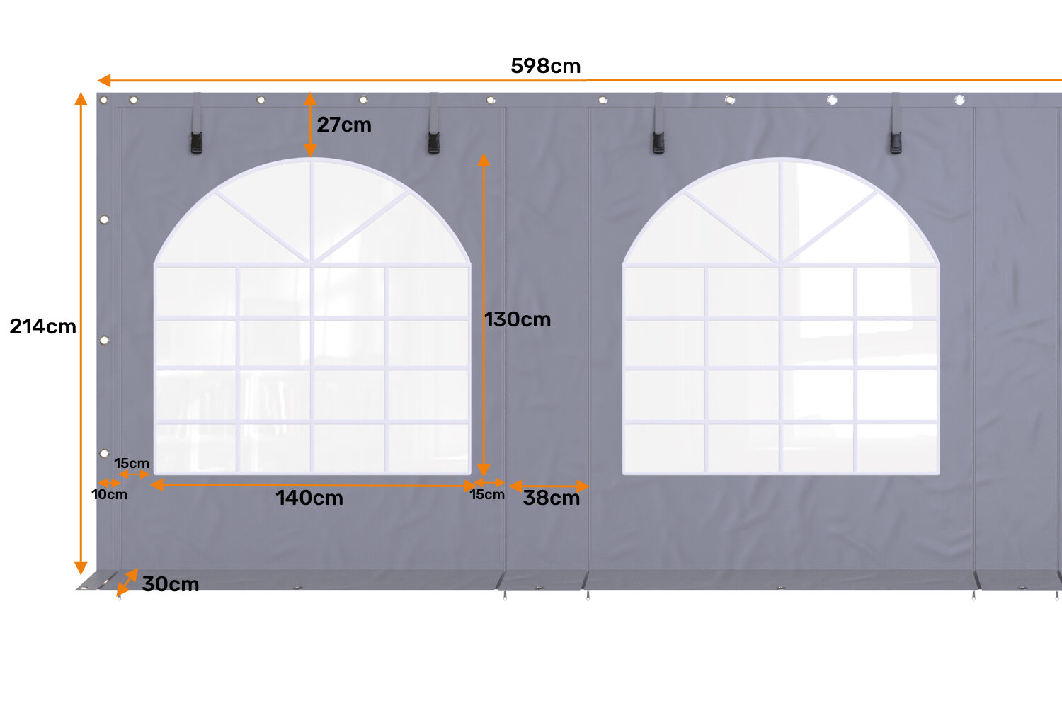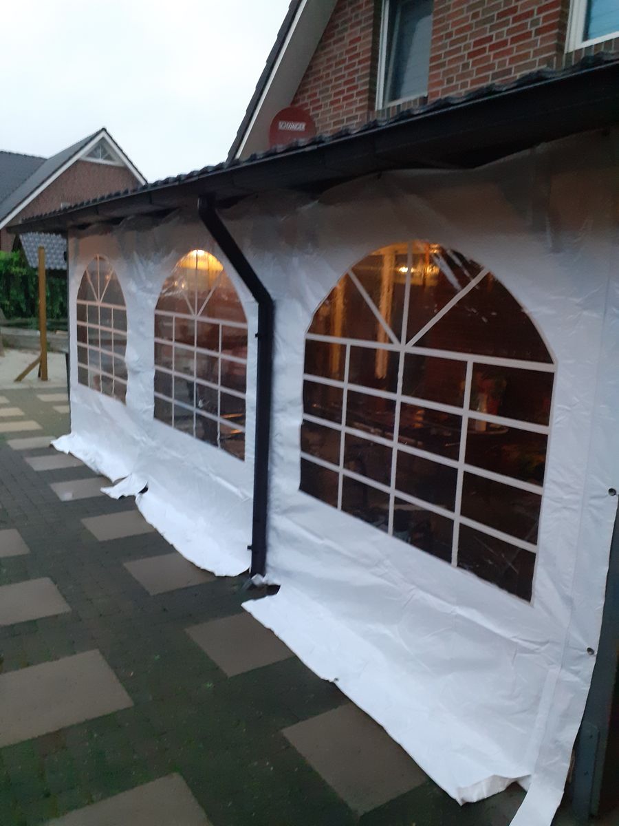 De partytent zijwand heeft volledig rondom metalen oogringen ter bevestiging aan buis of veranda balken. Je kunt deze op meerdere manieren vastzetten, met schroeven, elastieken of bijvoorbeeld klittenband.
