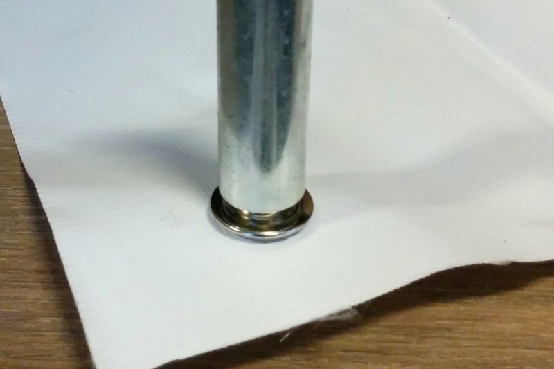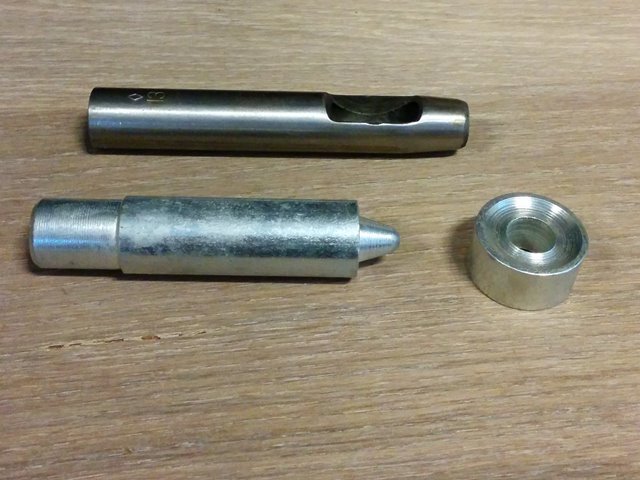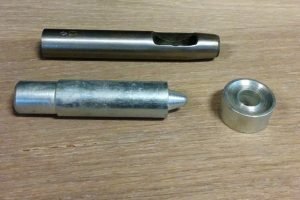 2. Sla met de hamer op de tool waarmee het 12mm ronde gat in het zeil gemaakt wordt. (leg er een stukje hout of iets dergelijks onder)