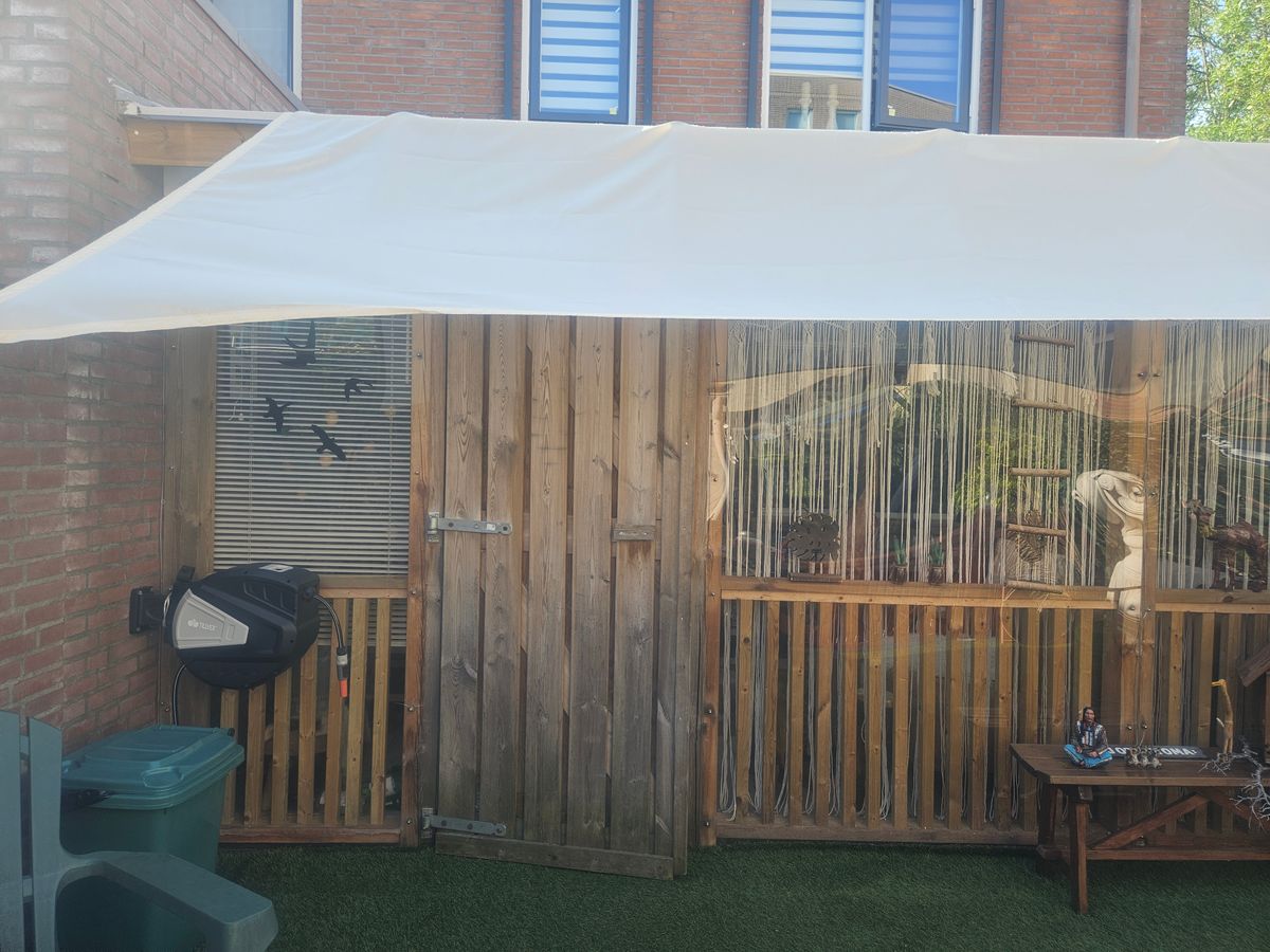Het doek is waterresistent, wat betekent dat het bestand is tegen lichte regenbuien. Houd er echter rekening mee dat de stiknaden bij zware regenval verzadigd kunnen raken, waardoor er water door de naden kan sijpelen. Het doek laat daarnaast licht door, wat zorgt voor een prettige, lichte schaduw.
