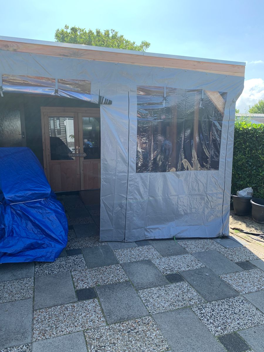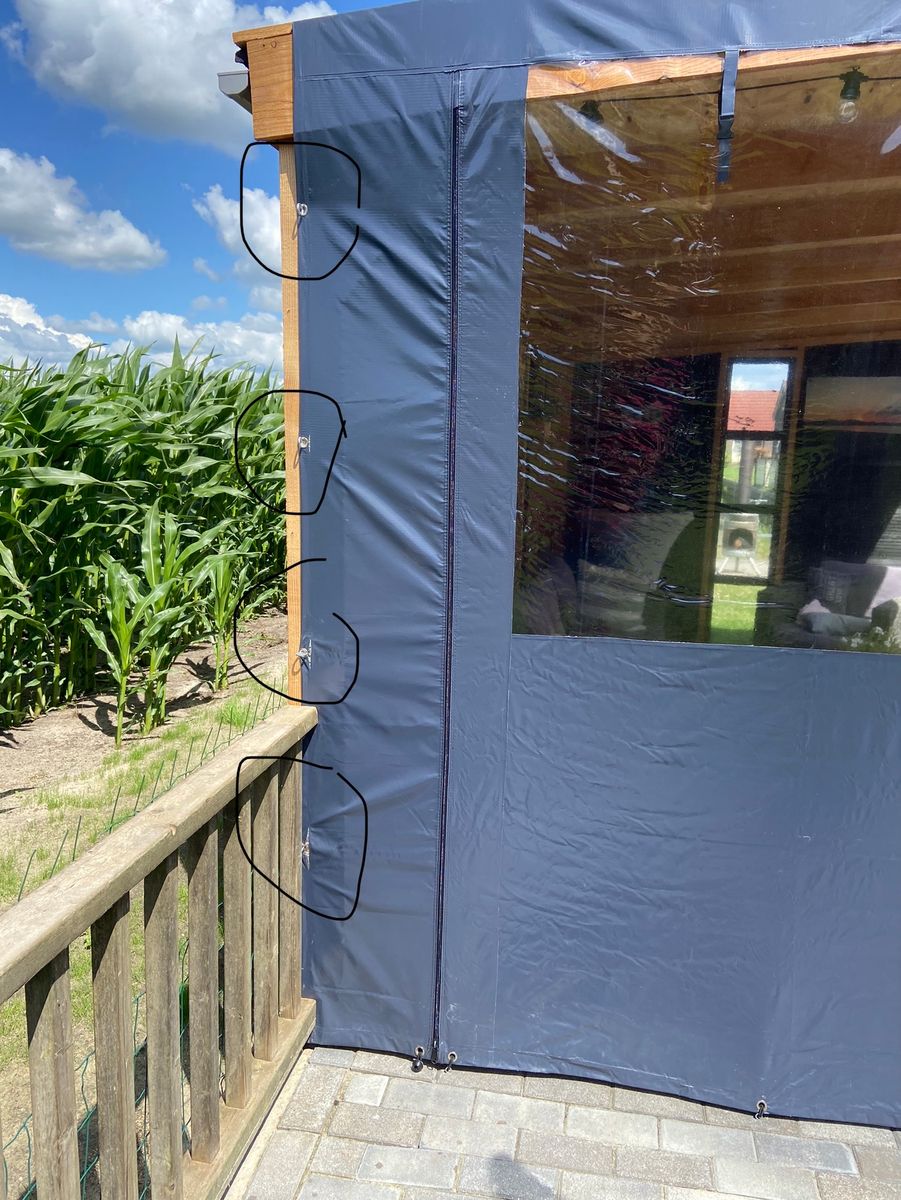 Onze zijwanden en overkapping zeilen hebben ronde oogringen rondom in het zeil zitten. Om de zeilen te kunnen bevestigen aan je houten overkapping kun je deze met elastieken vastzetten.
