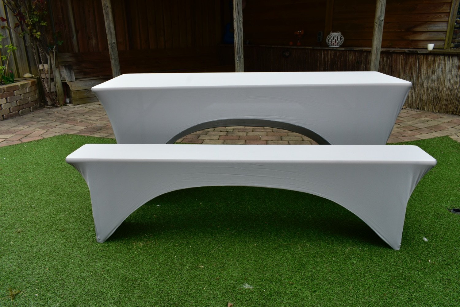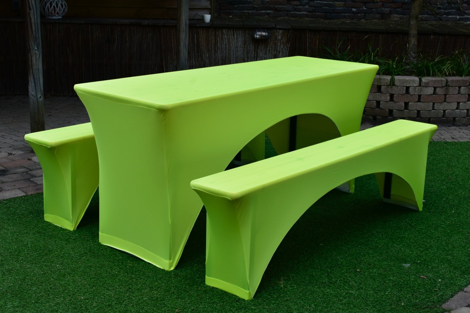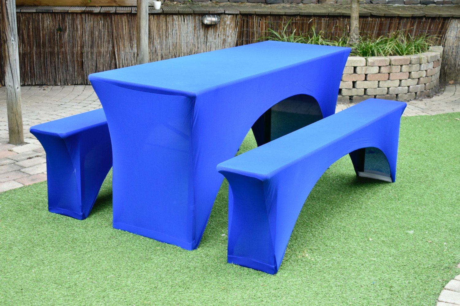Als de afmetingen van je biertafel iets afwijkt is dat geen probleem. Doordat de stof elastisch is past het gemakkelijk op biertafels en banken met geringe afwijkende afmetingen.