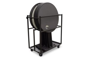 Het frame van de statafel is een gepoedercoat onderstel in de kleur Donkergrijs hamerslag. Deze verf is onder hoge temperatuur op het frame gebrand waardoor het niet los laat. Bij de statafel zijn ook trolley’s beschikbaar waar er 6 op passen.