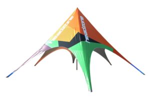 Let op: De stertent, met zijn imposante hoogte en lichtgewicht doek, is de ideale keuze voor evenementen, dankzij het opvallende ontwerp en de functionaliteit. Echter, vanwege deze specifieke eigenschappen, adviseren wij dat de tent niet voor langere perioden wordt geïnstalleerd en het is raadzaam om voorzichtig te zijn met het gebruik in omstandigheden met sterke wind. Het advies is om deze stertent niet op te stellen bij een windkracht groter dan 5 beaufort.