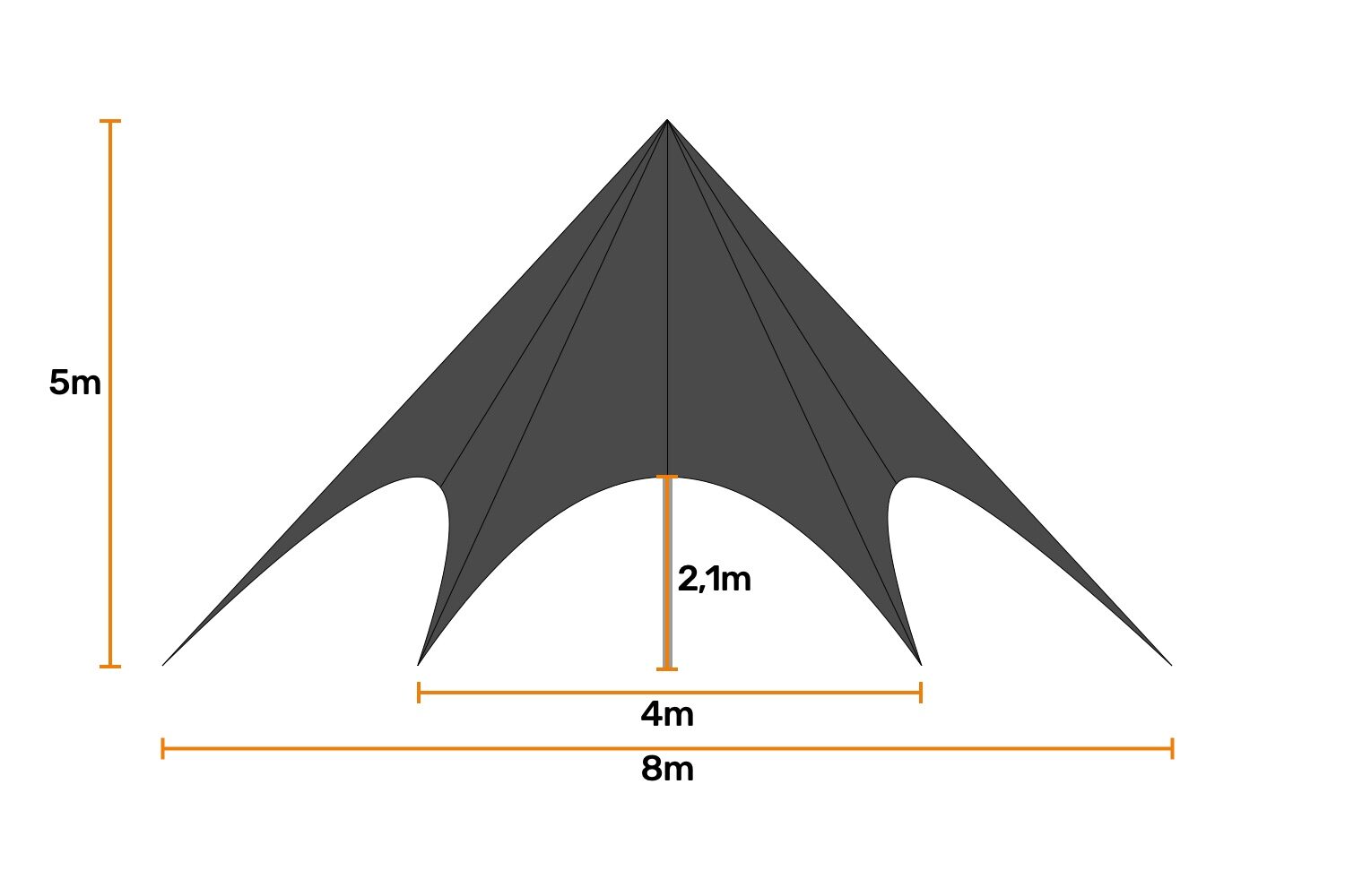 Onze stertent biedt een ruim en uitnodigend ontwerp met een totale breedte van 8 meter en een entreebreedte van 4 meter, perfect voor evenementen van allerlei aard. De doorloophoogte van 2,1 meter en een totale hoogte van 5 meter zorgen voor een comfortabele en toegankelijke ruimte, ideaal voor zowel staande als zittende arrangementen.
