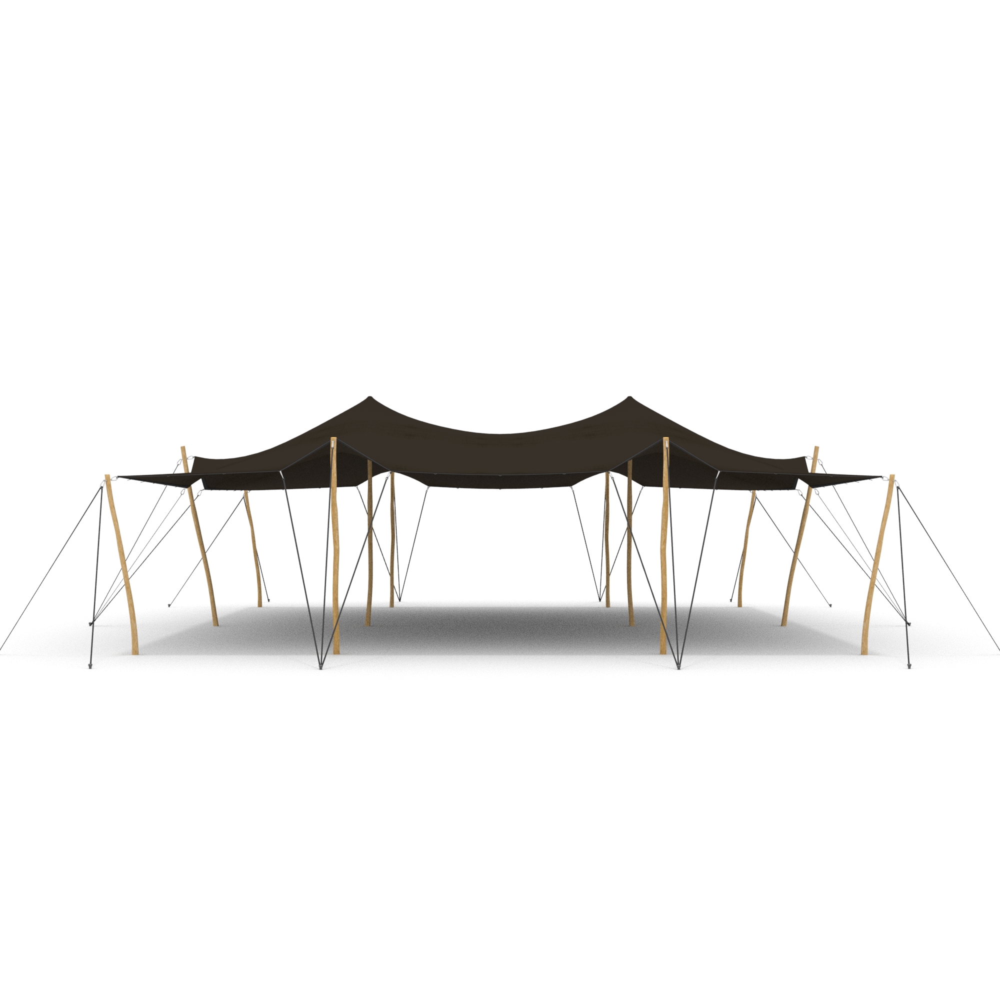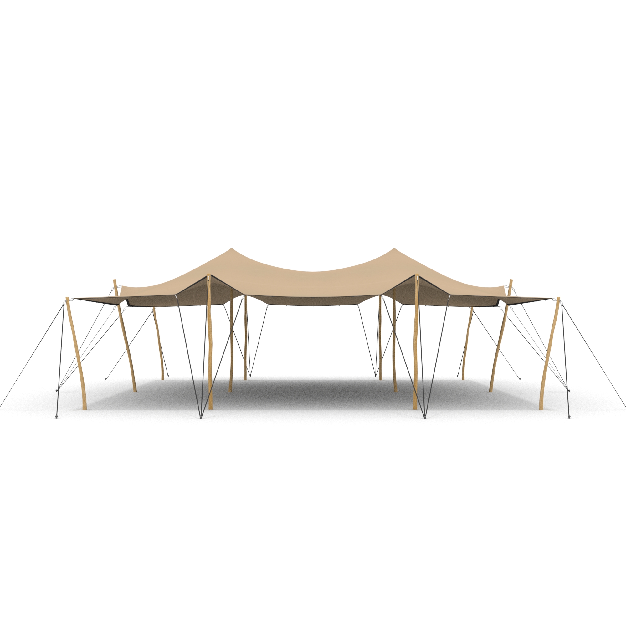 De palenset bij deze stretchtent bestaan uit verschillende lengtes palen. De ronde palen zijn geschilde kastanjehouten palen.