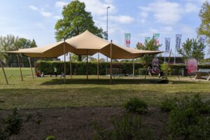 De stretchtent wordt compleet geleverd inclusief alle benodigdheden om deze op te zetten.